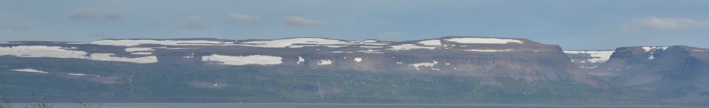 From the parking lot you can take a 2 km (1 and quarter mile) hike in to the reach the Valagil Waterfall. Unfortunately, we didn’t have enough time at this stop to make the trek. From our vantage point we could look south and west and see waterfalls. To the north, the landscape was snow-capped jagged peaks. For something requiring more of a hike, the most dramatic waterfall in the Westfjords is the Dynjandi Waterfall, also known as Fjallfoss.
