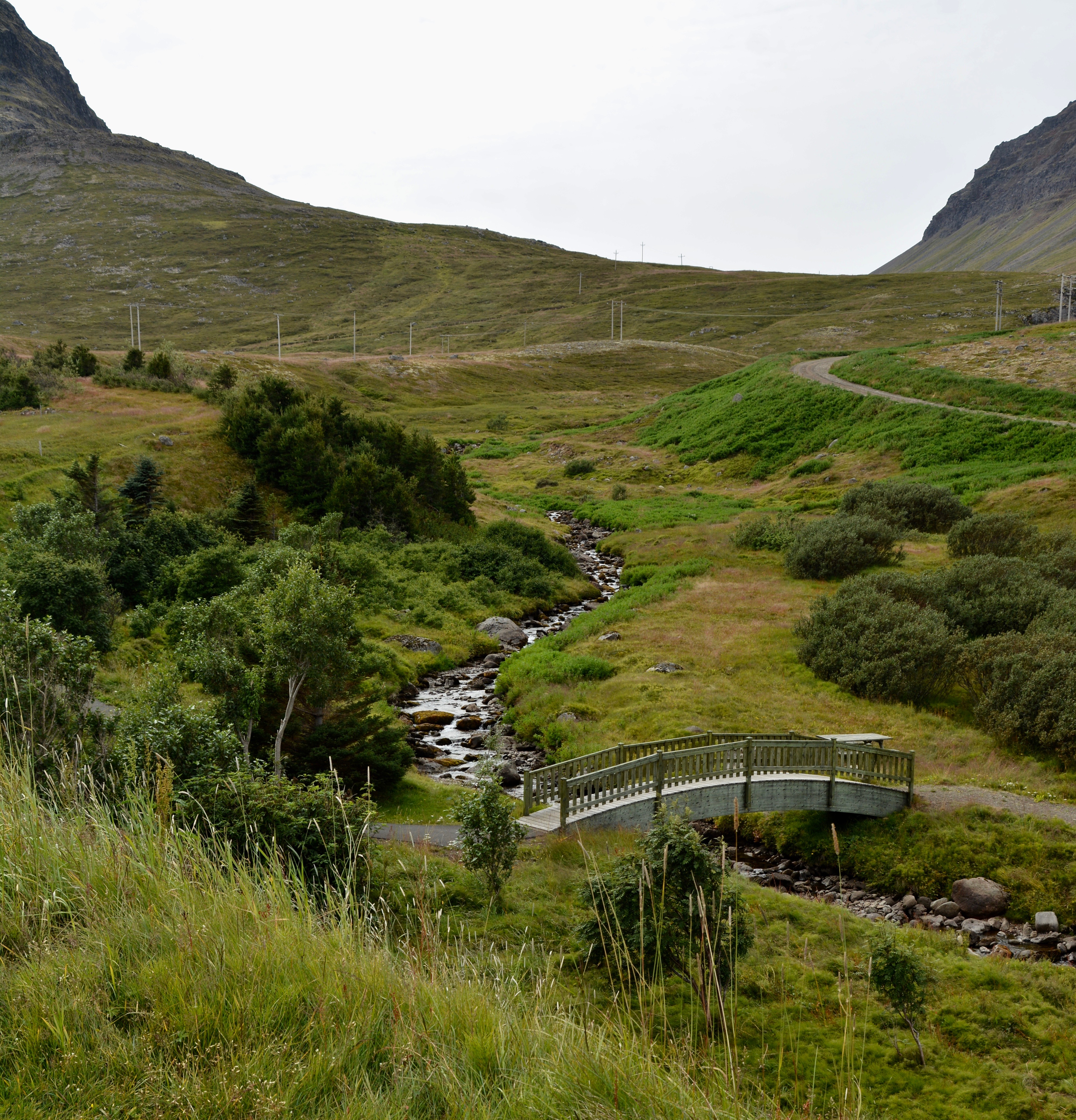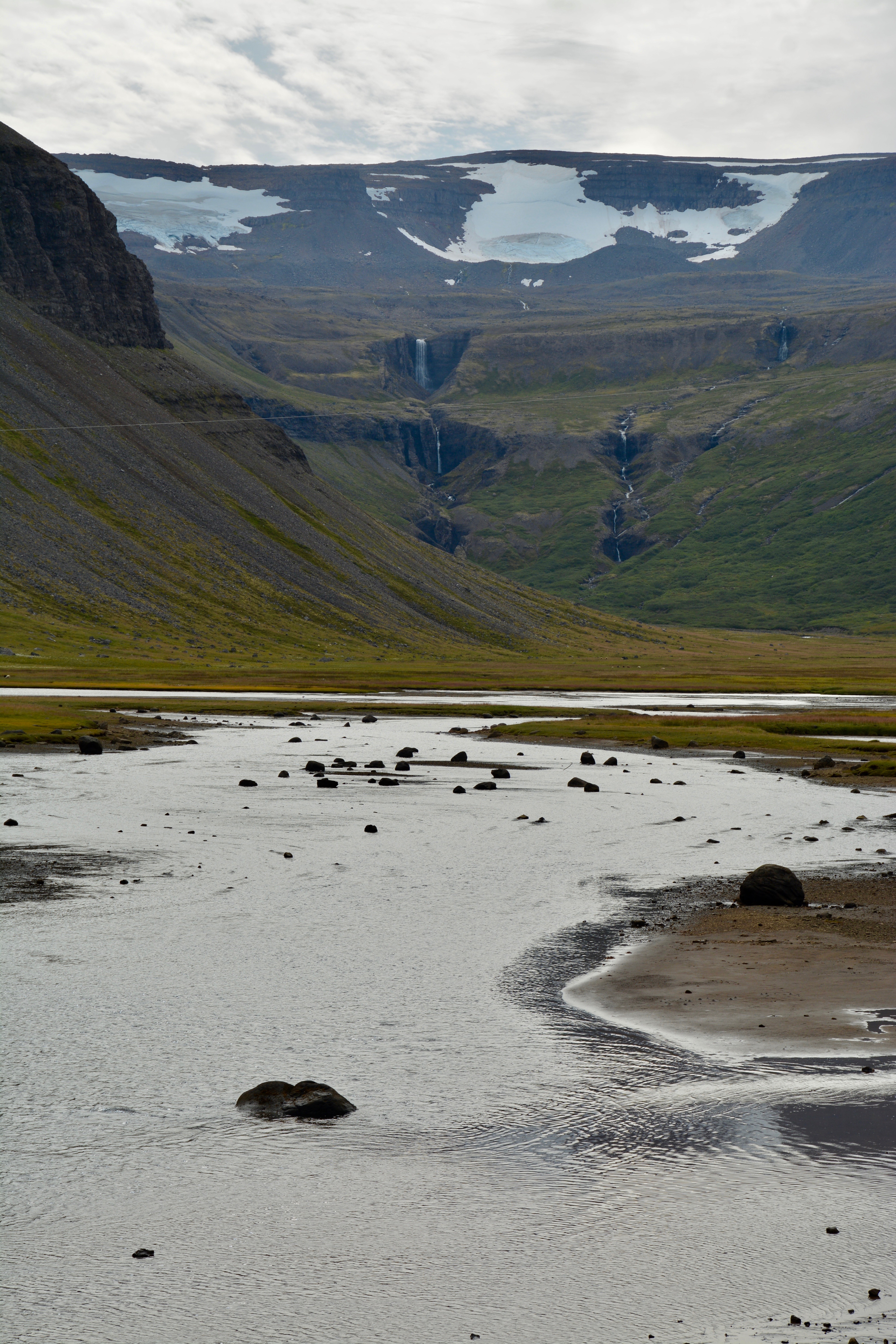 From the church we drove 9 km (5.6 miles) south to the end of the fjord to see the beautiful water flow to a trickle only to have the fjord fed again by the distant waterfall. It was a dramatic site with the high peak, the shallow water on the rock and the distant ice peak and waterfalls. In fact, from the viewing point near the carpark, you could see waterfalls in two directions.