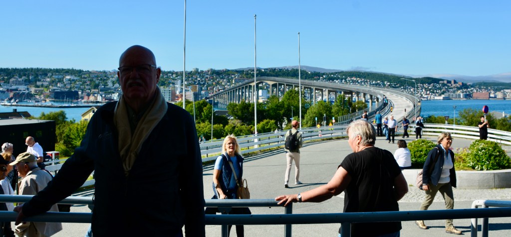 We decided to first take the walk over to the Arctic Cathedral, not to be confused with the city’s Catholic Cathedral or the Cathedral of the Church of Norway in the center of town that was closed this afternoon. The Arctic Cathedral is off island and just over a mile from the shuttle’s drop off point in town. What we hadn’t factored in was the incline when crossing the bridge. It was a challenging walk. The bridge was under construction so there was no vehicular traffic unless you count the bicycles which went along the opposite side. The pathway was only wide enough for two people going opposite directions to cross each other.