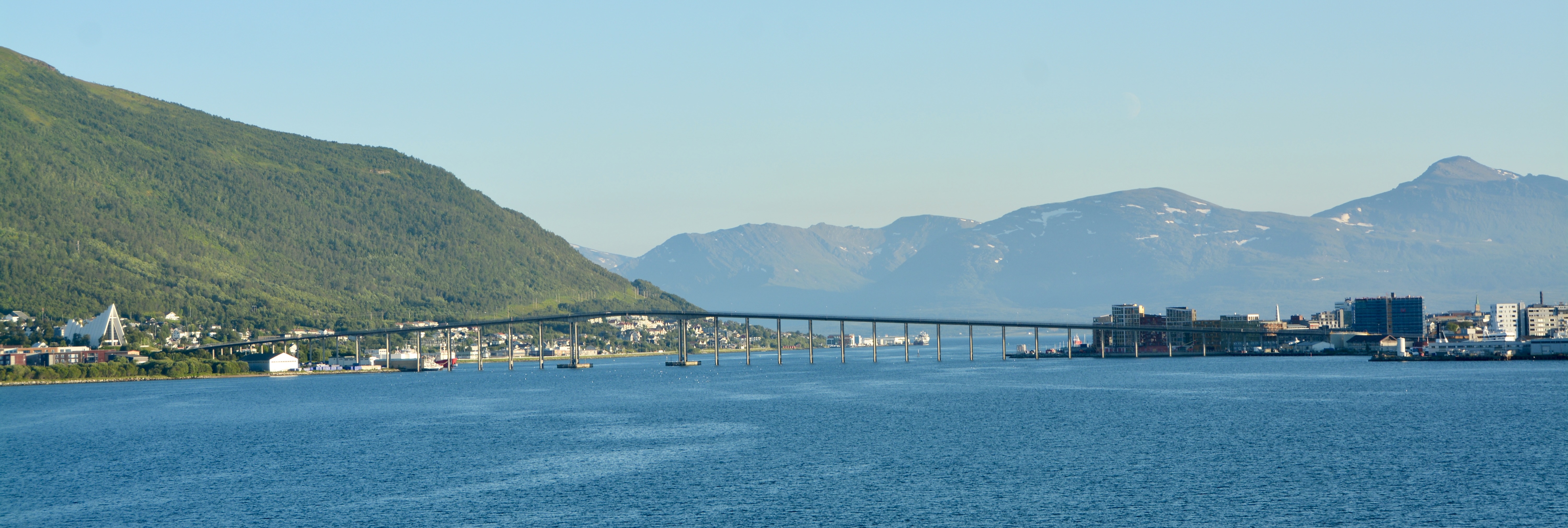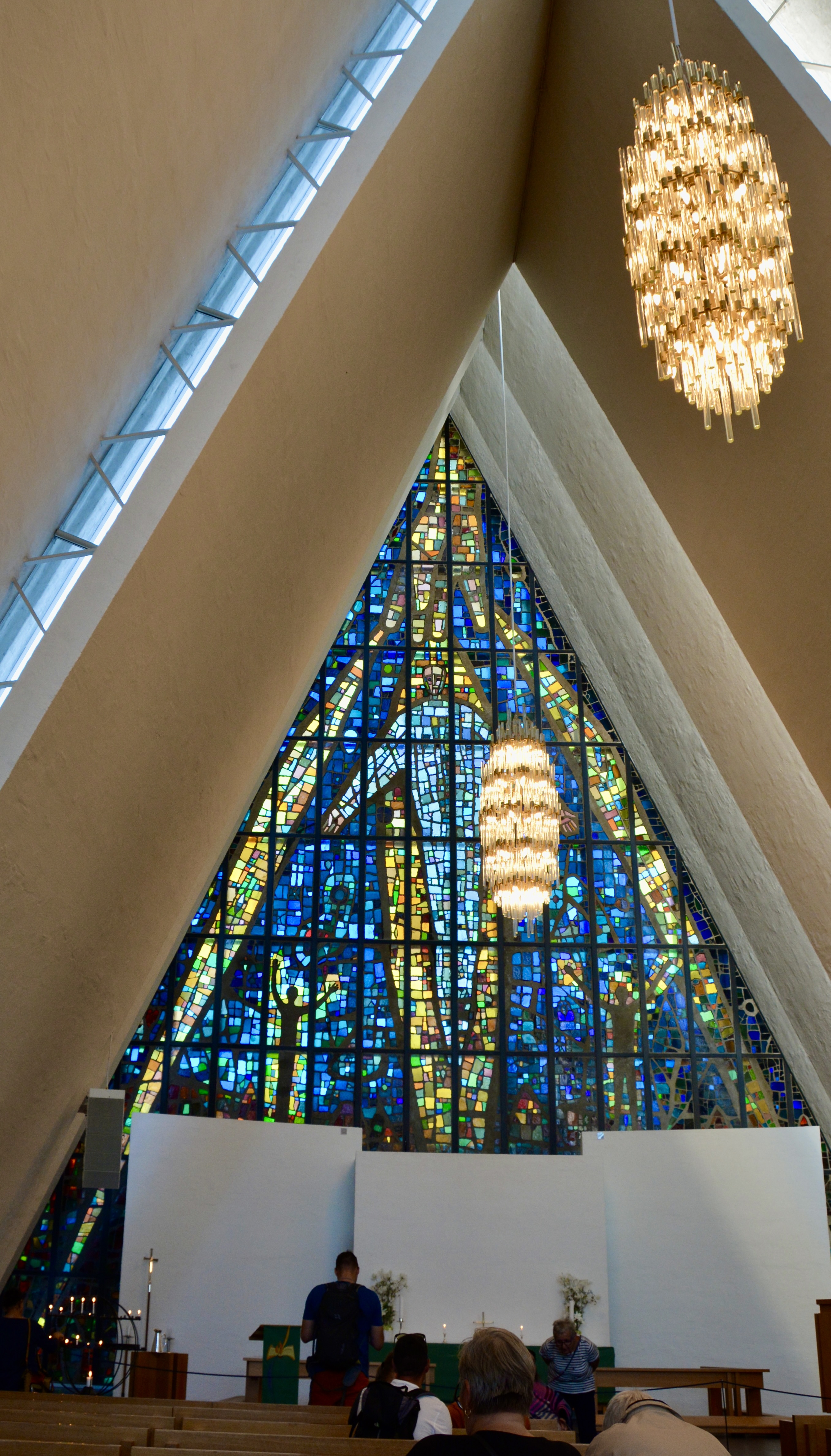 We decided to first take the walk over to the Arctic Cathedral, not to be confused with the city’s Catholic Cathedral or the Cathedral of the Church of Norway in the center of town that was closed this afternoon. The Arctic Cathedral is off island and just over a mile from the shuttle’s drop off point in town. What we hadn’t factored in was the incline when crossing the bridge. It was a challenging walk. The bridge was under construction so there was no vehicular traffic unless you count the bicycles which went along the opposite side. The pathway was only wide enough for two people going opposite directions to cross each other.