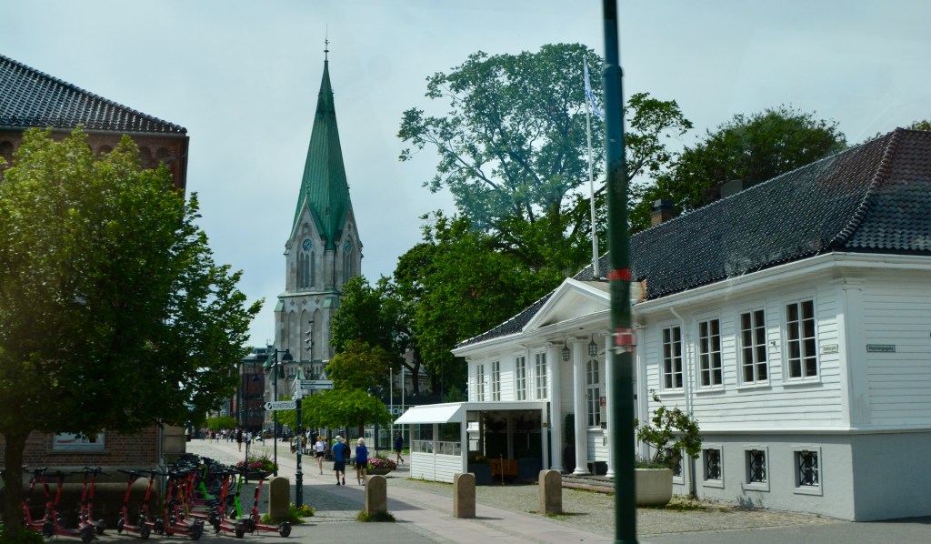 Just another selling point for the city, this is the hometown of the Crown Princess. She still has family in Kristiansand. She and the Crown Prince visit often, sometimes with their two children. The Crown Princess also has a son from a previous unmarried relationship. Prior to her marriage, she was a commoner and single mother. There is an understanding with the citizens and the press in Kristiansand that the royal couple will be treated as regular people and not bothered while in residence. Our guide told us a story of when she went to a charging station to recharge her car on the way home from giving a tour. She was in a hurry and wanted to ask the couple in front of her how long they would be. She thought they looked familiar and was embarrassed that she might not remember the name of someone she had met before if she spoke to them. Then she realized that the couple was the Crown Prince and Crown Princess. The Princess was in a sundress and the Prince was in just a tee shirt and shorts. The guide decided to let the couple take as long as they needed to charge their car and she stayed in her own car instead of approaching them.