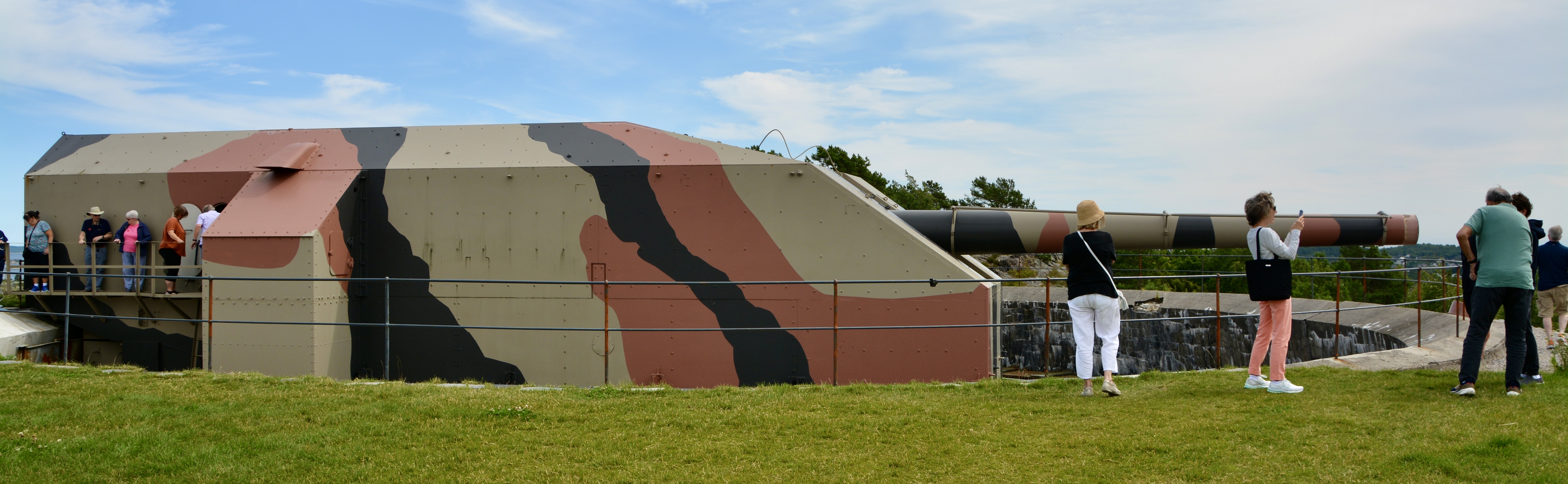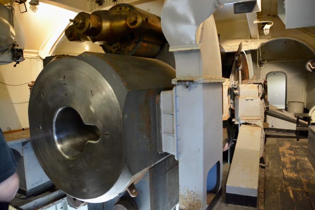 We were able to view the cannon and the track it rotated on from ground level; go inside the control center of the cannon and look straight down the barrel which was open; go underneath the cannon where the bombs were stored and loaded; see where they did the strategic calculations to target; and go outside at the lower level to see the base and access points.