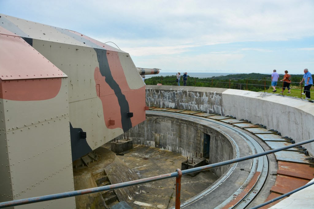 Our first stop is at a military site where the Germans installed four large canons. It was done late in the war, 1944. The installation was never actually completed. You could see the remains of one of the large concrete bunkers that were to have covered each of the cannons. The one cannon that remains is uncovered. It rotates a full 360 degrees and could still be operated (if someone knew how to do it). Once a year, the Norwegian military makes a complete rotation of the cannon, although no artillery is set off.