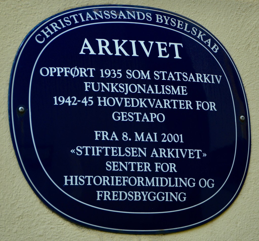 When the Germans took control of Kristiansand during WWII, they took over the older building as their Gestapo headquarters. Years after the war, the Norwegian government was going to put the building on the open market for sale and a foundation lobbied to keep it as an education and documentation center. It was sold to the foundation for one kroner. Stiftelsen Arkivet houses the Institute for Dialogue and Conflict Resolution and the Center for Humanitarian Organizations.