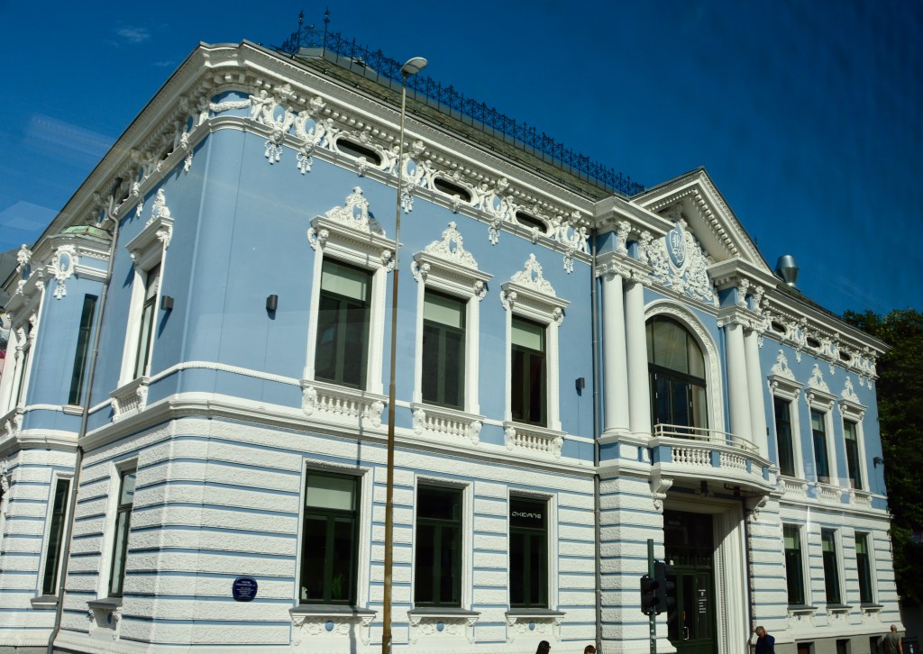 Our next excursion stop was a visit to a structure that was originally built to house the local archives. You could see the older original building and the new glass structure that sat next to and attached to it. It was in a lovely neighborhood with beautiful homes nearby. I took a picture of the exceptionally pretty home on the corner before we walked in.