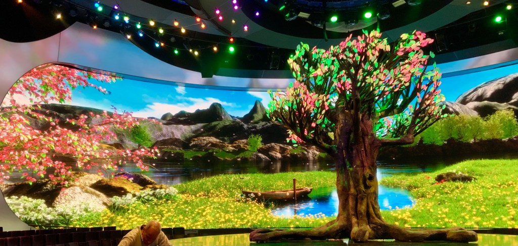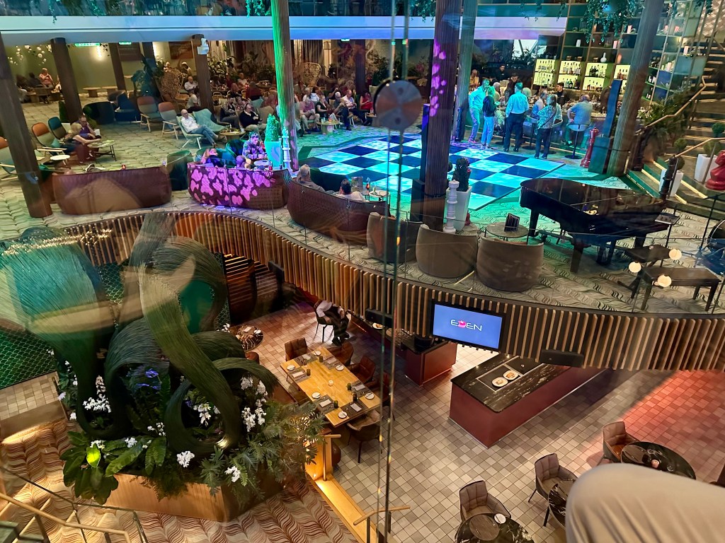 It was fun seeing “behind the curtain”. It’s a new show, roughly based on Alice and Wonderland and the performers were costumed accordingly. We talked to the director afterwards. She is a former Celebrity performer. The cruise line has its’ own production company based in Miami (Florida, USA). Celebrity is part of the Royal Caribbean family of cruise lines. The director works for the production company. She comes on board for two weeks as they put the final touches on a new show. The Eden Production Cast will do Night of Dreams at 10:45pm on our last night of the cruise. Needless to say, we got to bed after 1 am after watching the technical rehearsal.