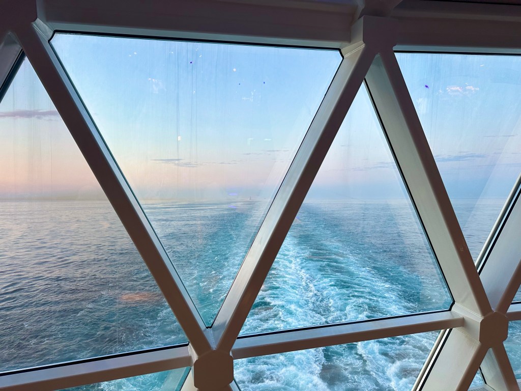 These are lazy days for us. The lectures held no interest for us. It is cloudy and cold, so not great pool days, although the solarium is popular. I spent my time editing photographs, writing blog posts, reading, hanging out in the solarium, and researching future cruises. I did enjoy the second production show, The Tree of Life. It was upbeat and featured songs from more recent decades. The “tree” and background screen went through the seasons of the year. We heard back from Sue and Andy and met them for dinner the night of the second sea day. We just switched tables and still had our favorite waiter Mo serving us.