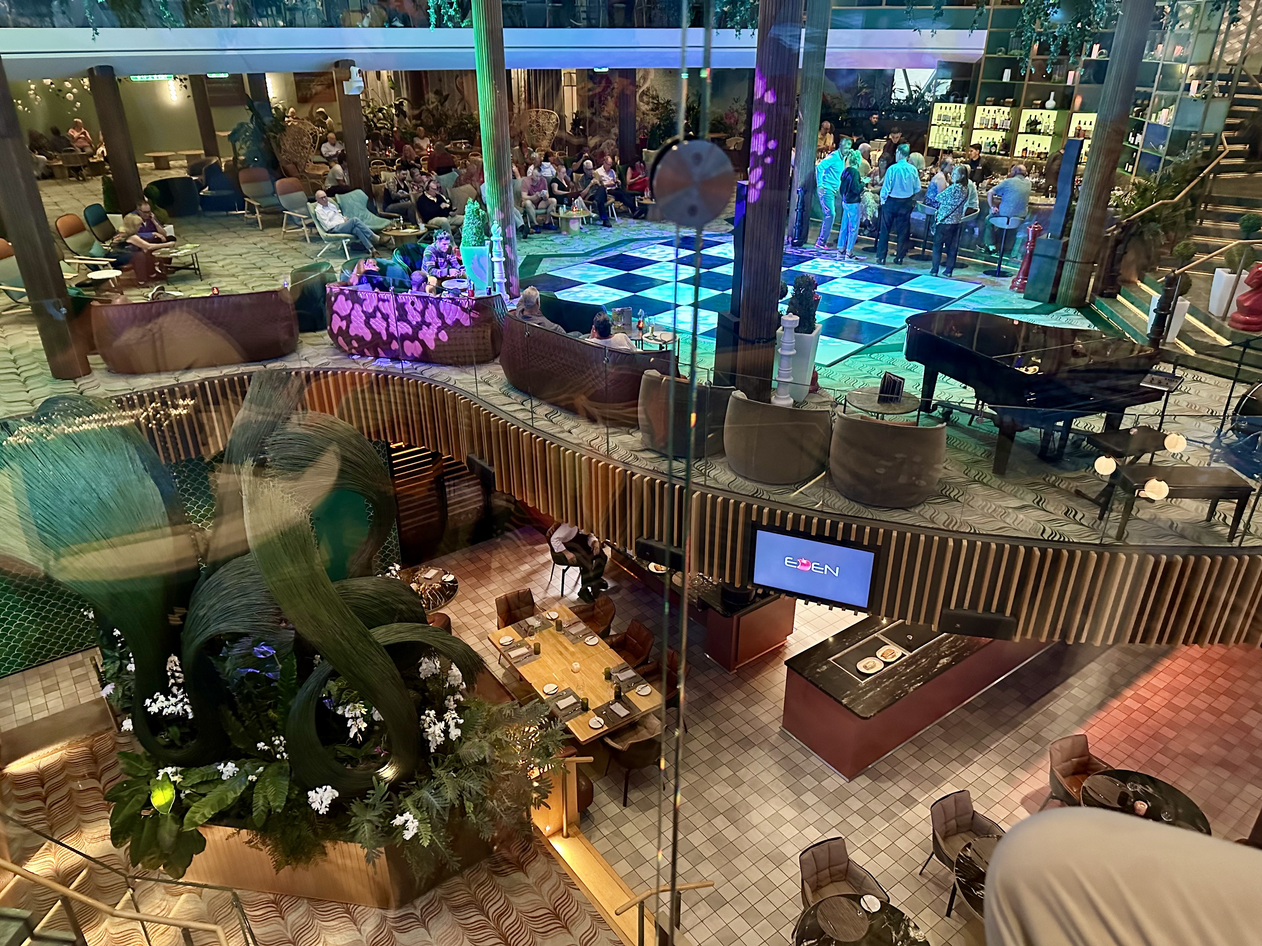 After dinner we went to the show and then on to “The Club” for the Abba sing-along, my choice. Sue and I really got into it. Afterwards, Sue suggested a nightcap at Eden so we headed up there after 11 pm. The bar ended up closing shortly after we arrived so the Eden Production Cast could so a technical rehearsal in costume (cue to cue for lights, sound, etc.). Guests were invited to stay if they liked. I have seen and been through many technical rehearsals as I have been involved with theater, but it was a new experience for Sue, Andy, and Boris.