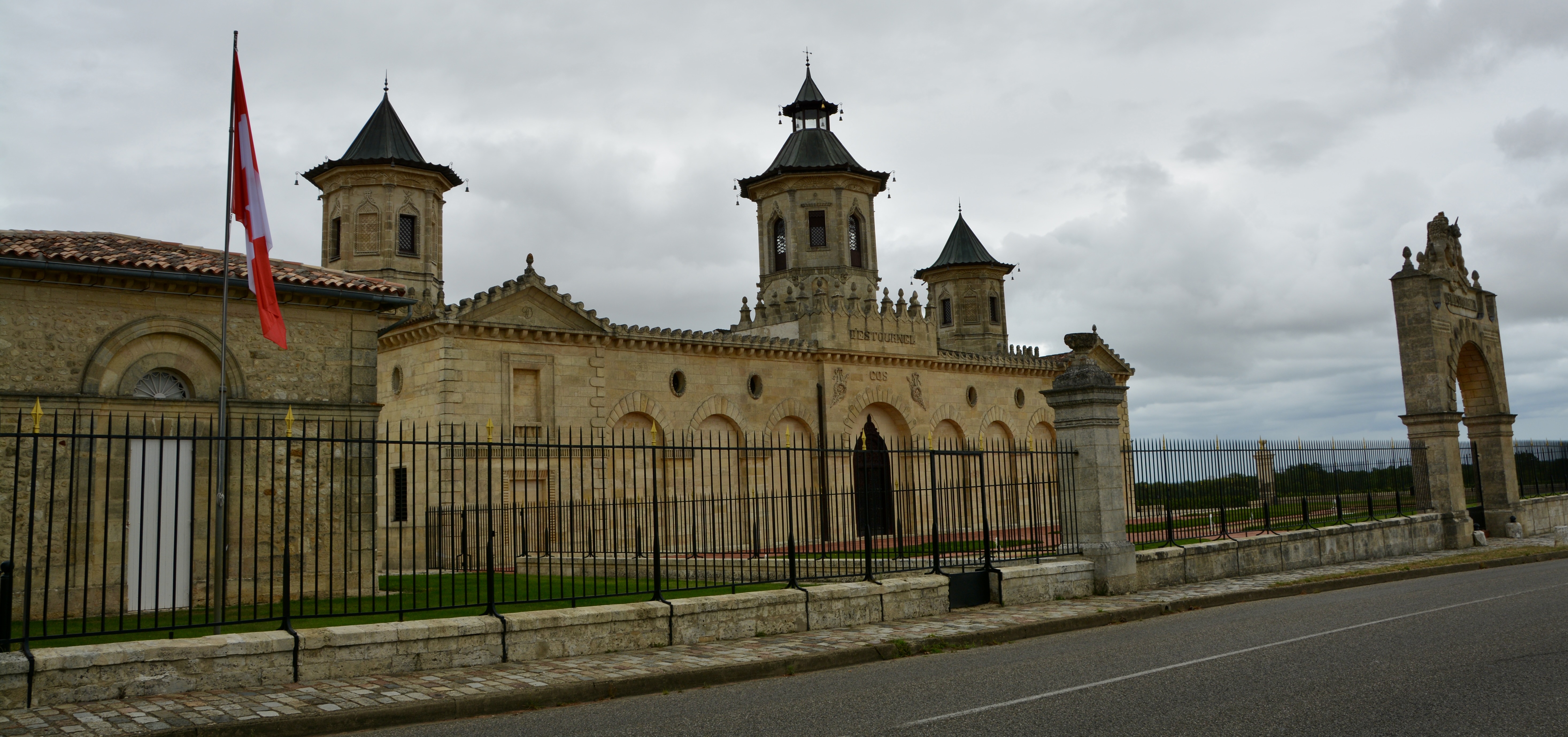 We drove through the countryside seeing the beautiful vineyards and gorgeous chateaus. We made a photo stop to see a chateau built in 1791 by an eccentric owner with a fascination for Asian architecture. The flags outside the Chateau Cos d’Estournel depicted the nationalities of the guests staying on site. The property is adjacent to Chateau Lafite-Rothschild.