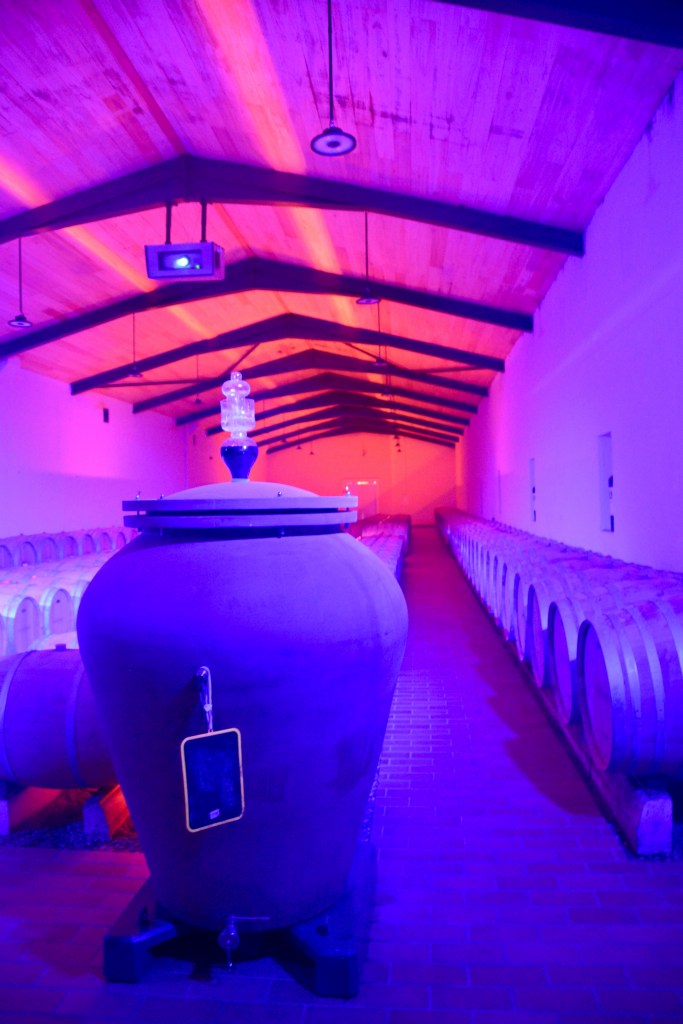 After seeing the vines, we toured the production facilities. I asked about the interior lighting and was told it indicated what stage in the process the wine inside the stainless steel vats was at. It looked more aesthetic to me. I am not sure the guide’s response wasn’t lost in translation. They use French oak barrels of various sizes and large clay vats to age the wine. After the production tour, we retuned to the chateau for our tasting.