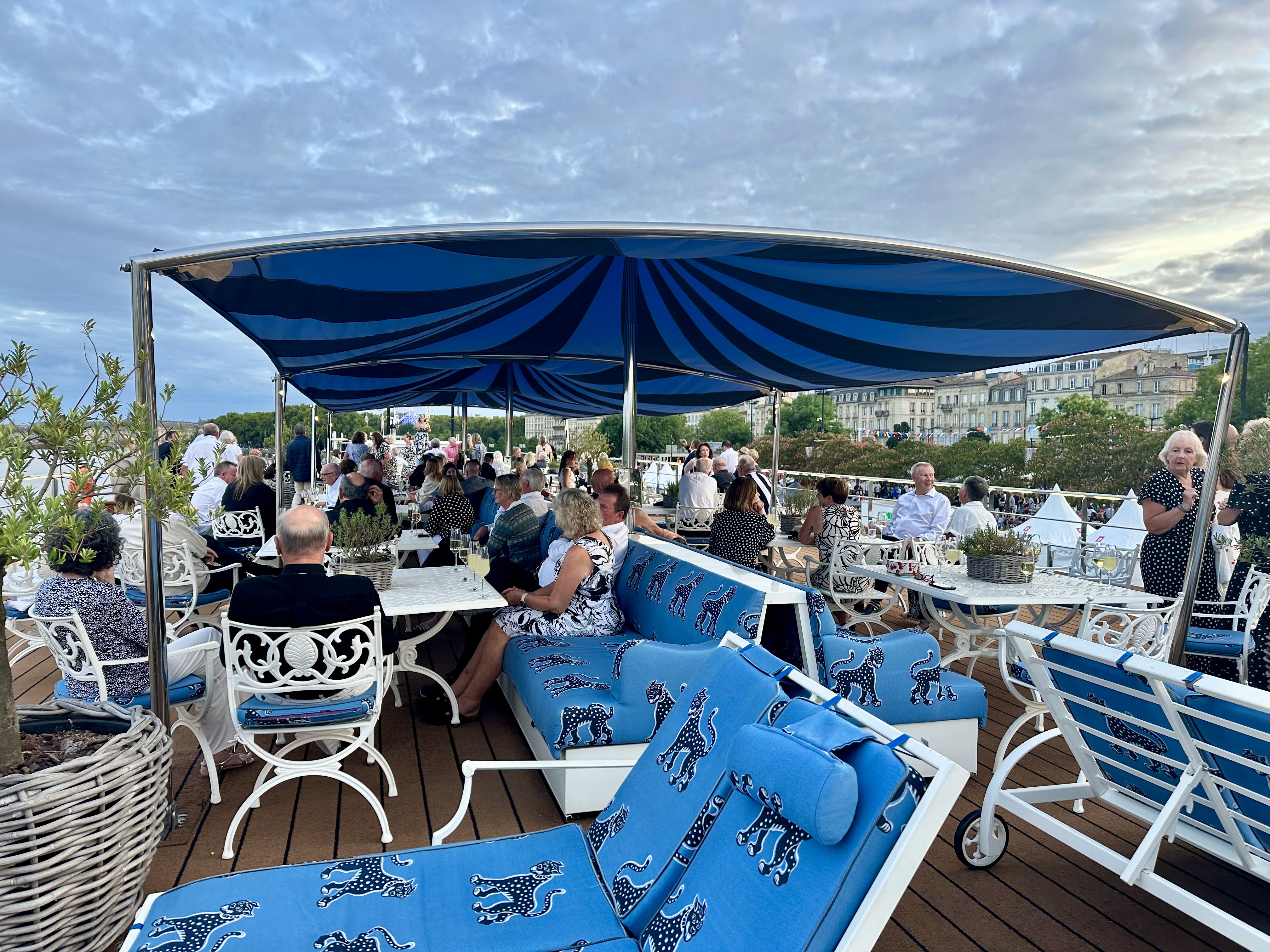 The celebrations are nationwide and we saw the set up for the festivities at Fort Medoc and in Pauillac. Tonight, we are docked in Bordeaux so we can enjoy the fireworks at 10:30 pm. It’s that late before it gets dark here at this time of year. After dinner, I went to our upper open deck and enjoyed the featured French 75 cocktail, one of my favorites with gin and champagne. There was a singer performing lots of 80s and 90s classics live. The dance floor was full. What a great start to our cruise.
