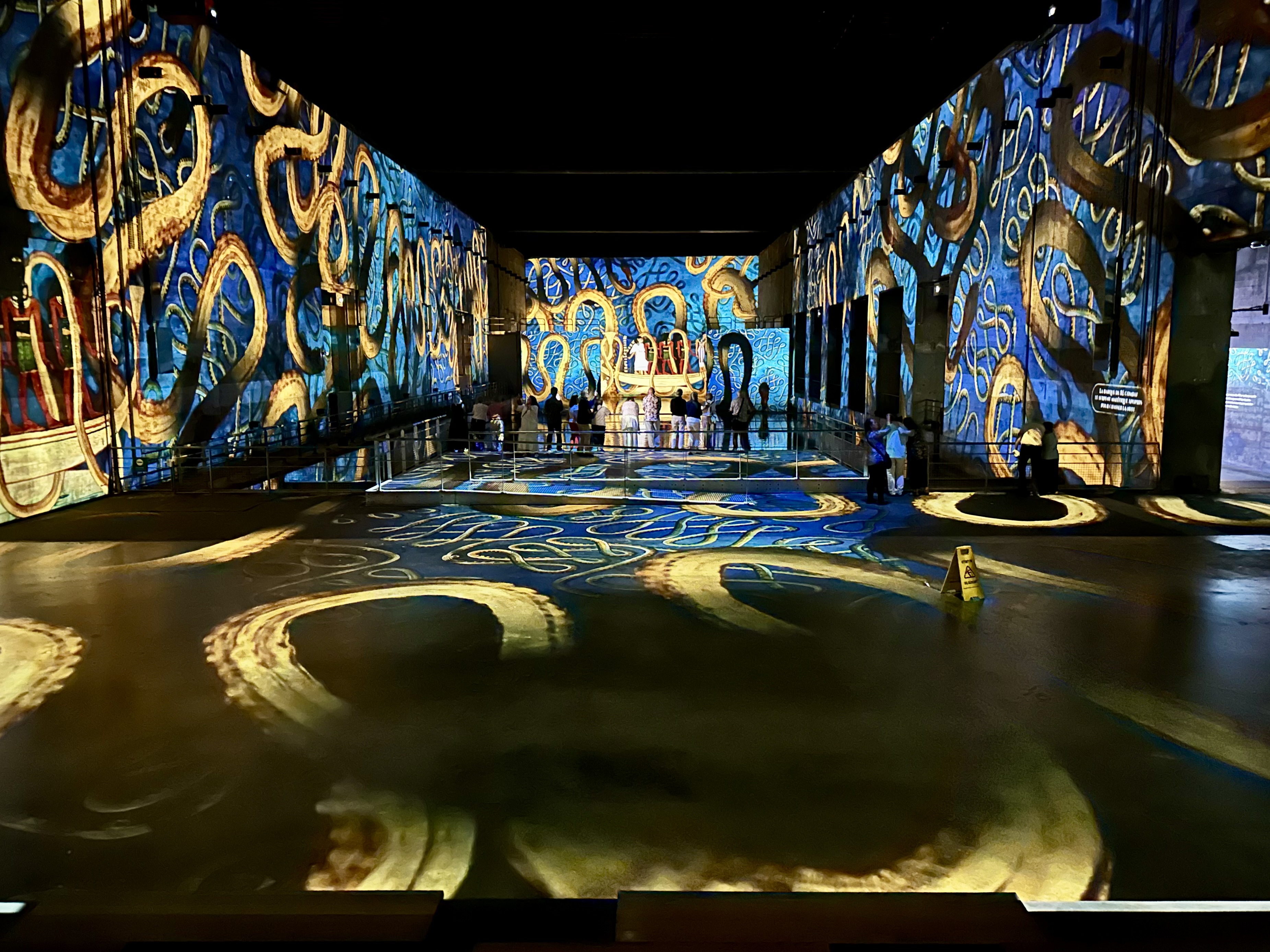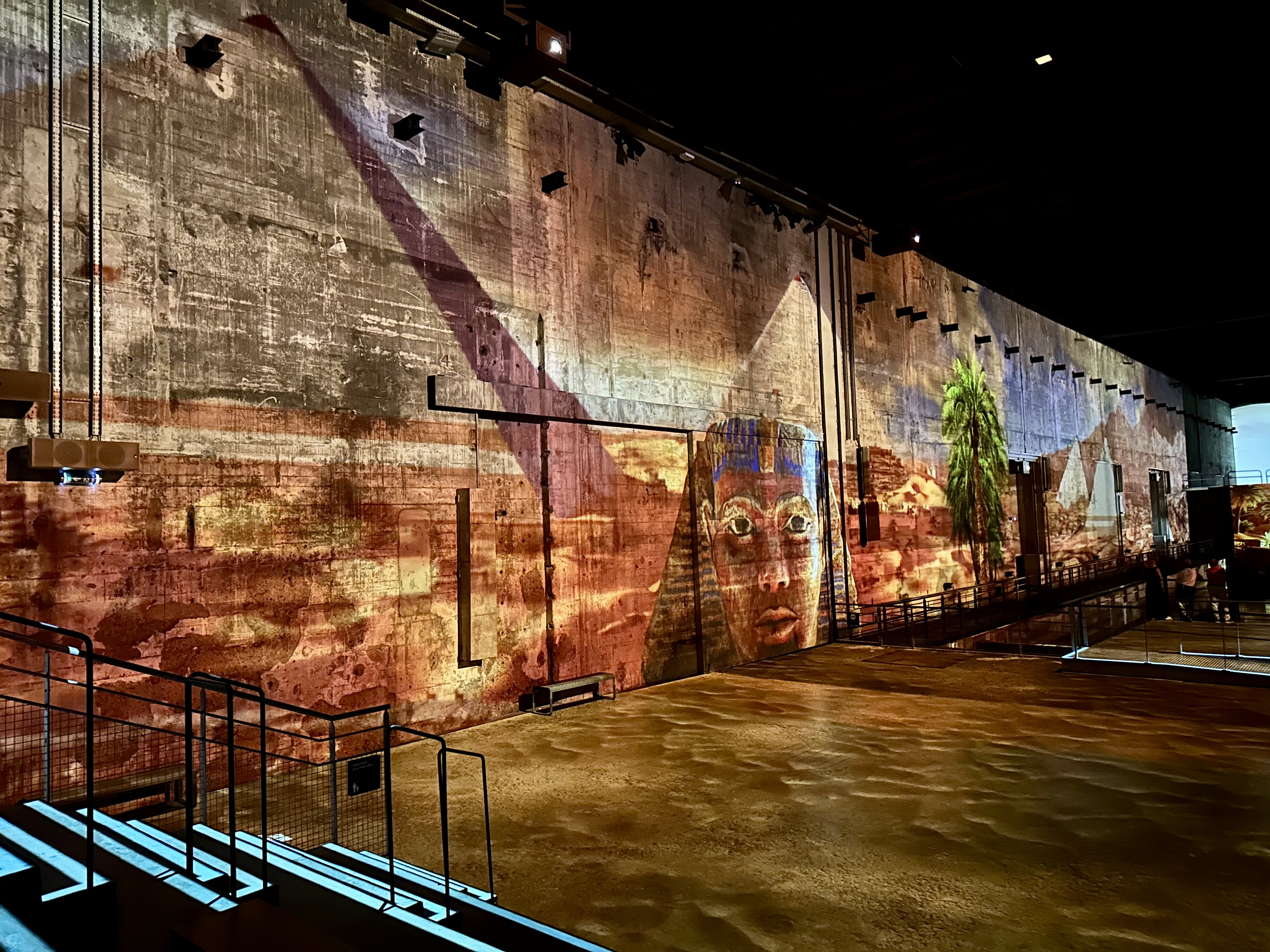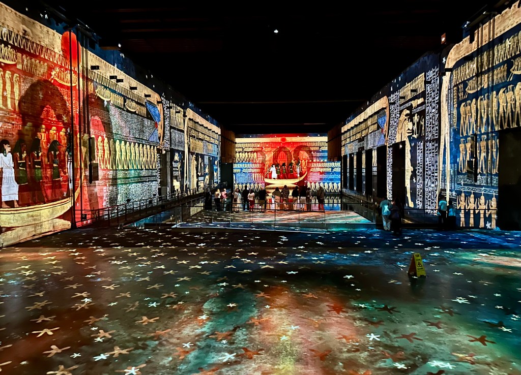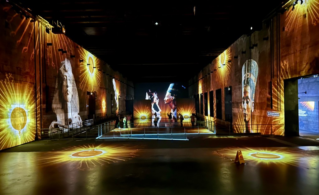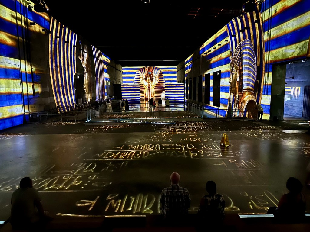 The projections are on the wall, floors, ceilings, and even on the water in the bays. Like the show we saw in Les Baux de Provence, there is a long segment followed by a short one. Our long program was on the Egyptian Pharaohs and the short program was the Orientalists. I enjoyed both. You could walk right up to the front of the bays, on platforms over the water, and all along the sides. There was limited seating in the other bays.