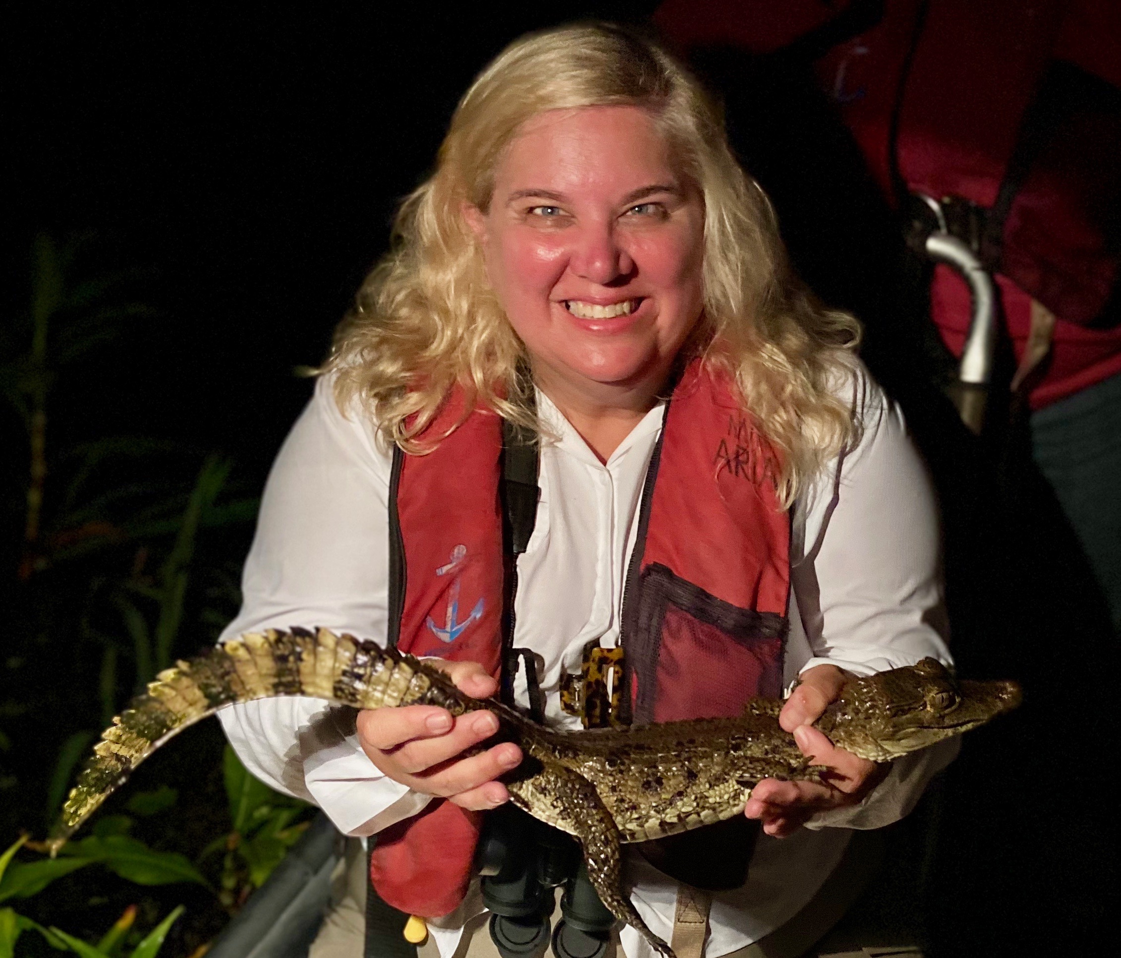 Our speaker enhanced the experience immensely. I would not necessarily have known what I was seeing otherwise or known the background. At each set of locks, he referred to the “free fish buffet”. The crocodiles were hanging out on the shore waiting for the water (and the fish in it) to be discharged. There are lots of signs warning against fishing, but it is not unusual for a fisherman to ignore the signs and be taken by the crocs. The speaker called them crocodiles, but he also said that in this part of the world they are probably caiman. I held a caiman last May when we were traveling on the Amazon River in Peru.