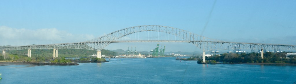 Of course, you could walk up between the chairs and take pictures. Boris set his sights on moving closer to the front windows as seats became available. Our first point of passage was under the Bridge of the Americans. For many ships, their height keeps them from being able to pass under this bridge. It is a problem for many of the larger cruise ships. Just FYI, this post is about our passage through the canal. For more on the background for a canal being built in Panama, check out yesterday’s post on Panama City including limited history on the canal.