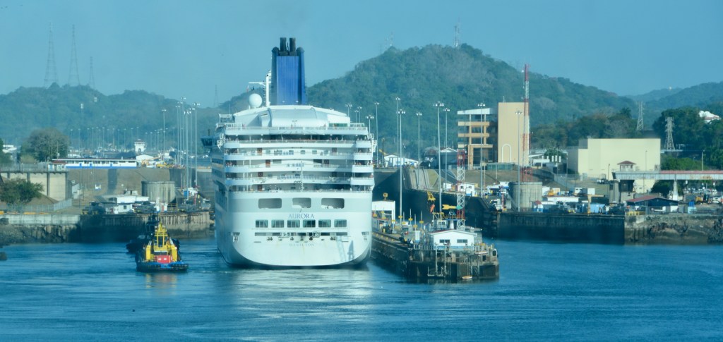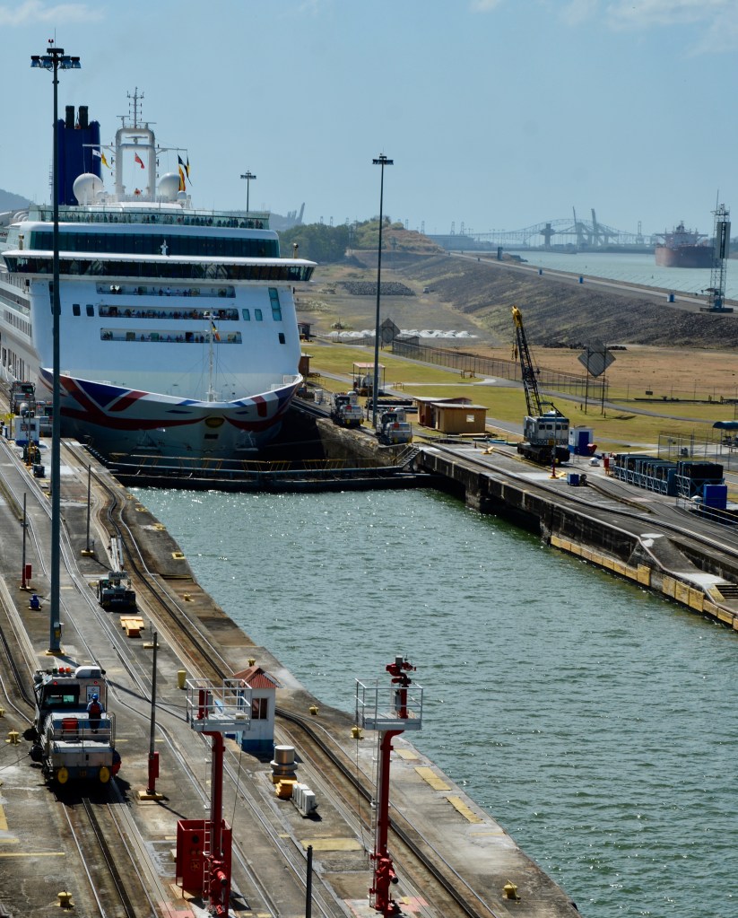 According to our speaker, “we are a big deal going through”. Cruise ships going through the canal draw lots of locals. The schedule is published in the paper and people come out for the cruise ships. There is a visitors’ center, viewing platform, museum, and an excellent IMAX theater. Several people from the ship went on an excursion there yesterday and really enjoyed the experience. They were particularly impressed with the IMAX. We are going through today with another cruise ship. About 44 ships a day go through, usually in convoys of 4. They mix the big ships with the smaller ships. The cruise ship in front of us has two tugs on the lead sides. Their appointment was one hour before ours. We will not be using tugs. If you don’t have a reservation, you may have to wait and go through with a night convoy.