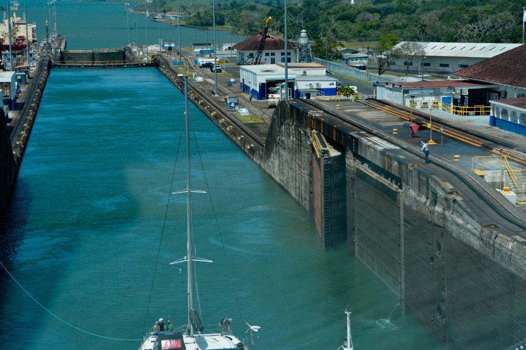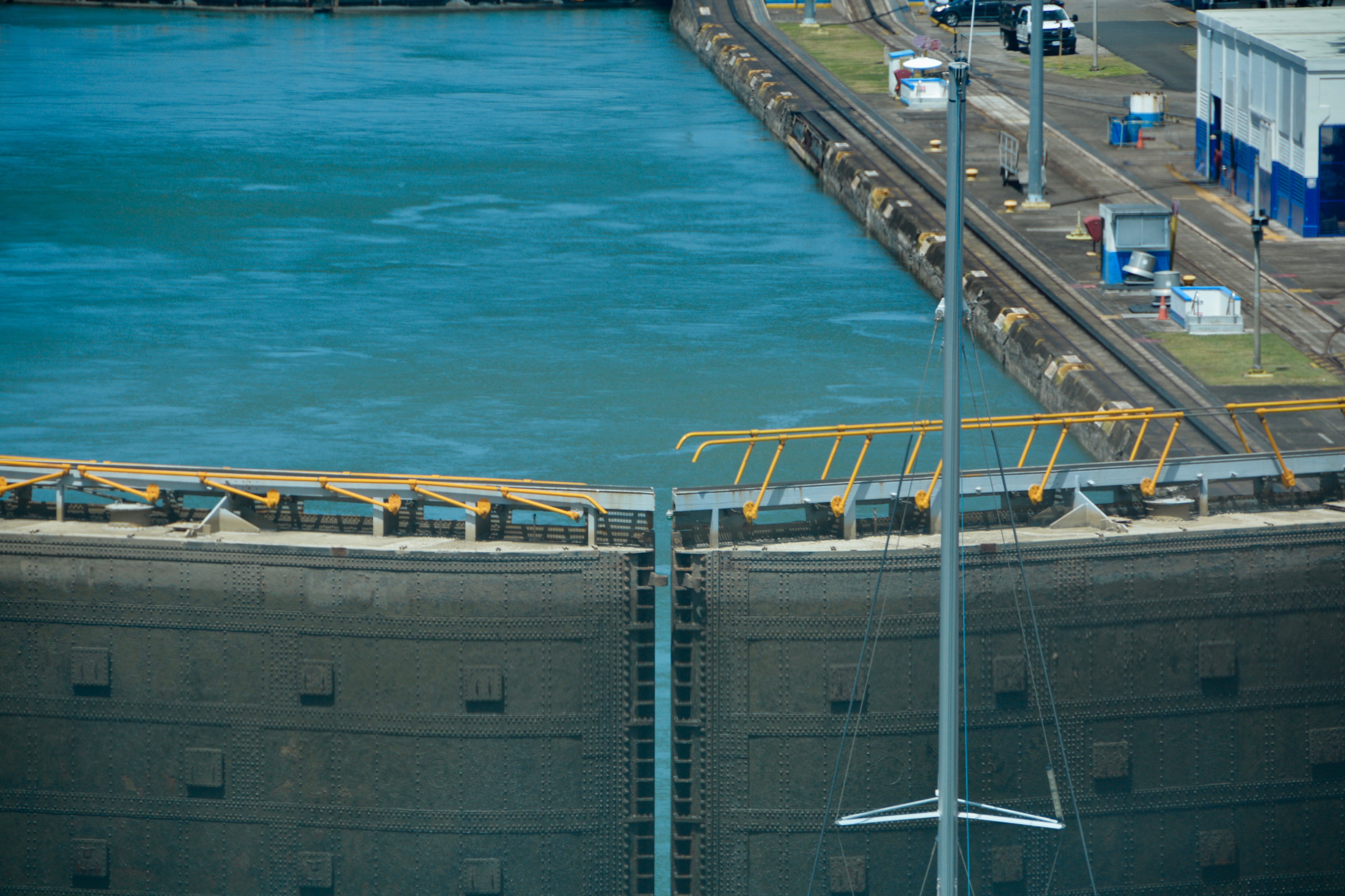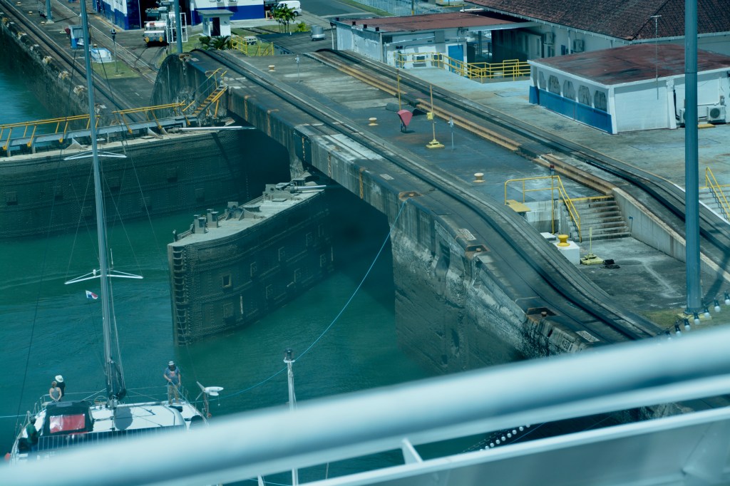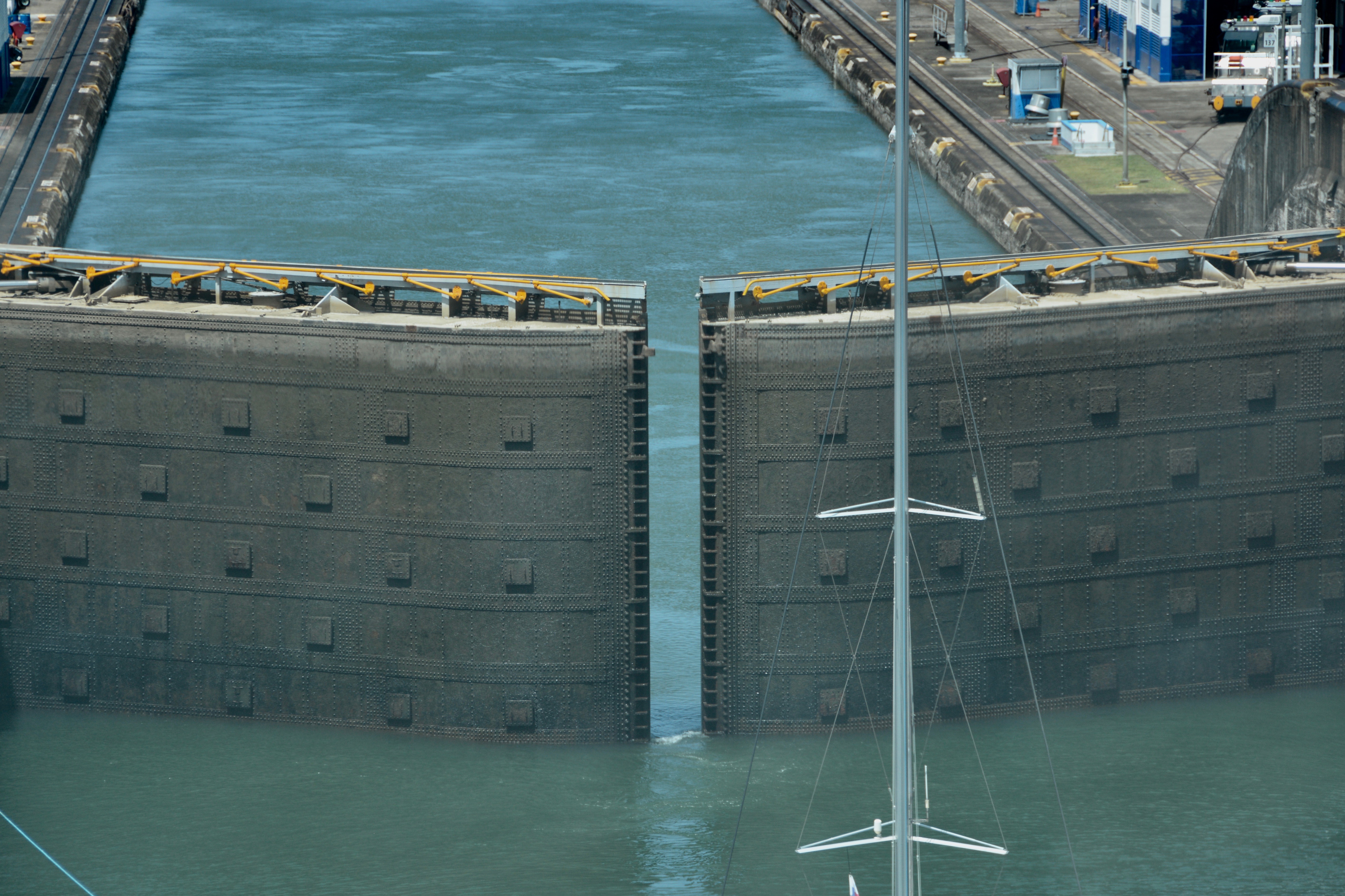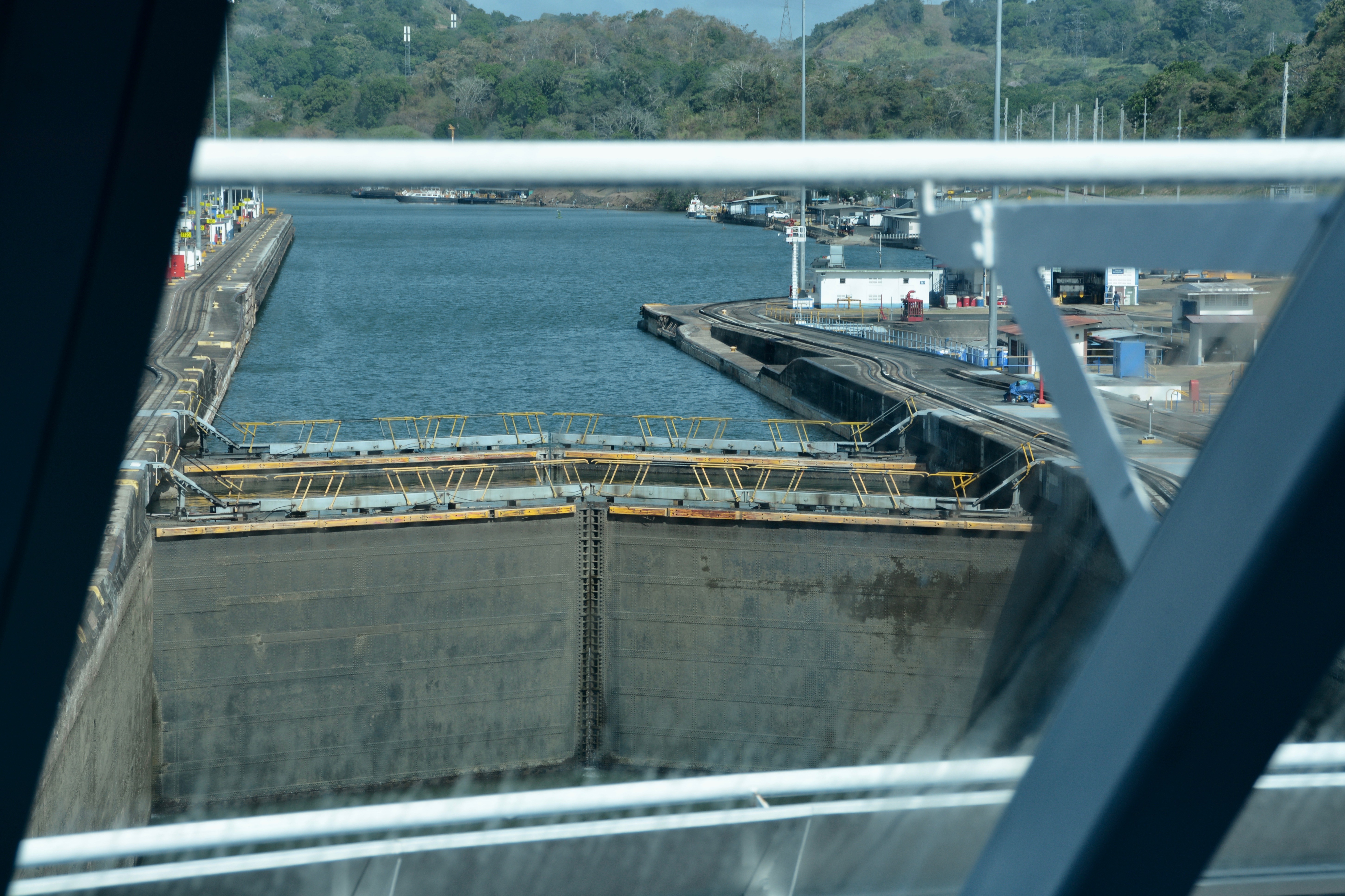 It didn’t take long to reach the Pedro Miguel lock. Like Miraflores, it has two sides. However, this time there is a single lock on each side. Also, there is not one, but two gates at the end of the chamber. This is for added protection just in case the first one is breached or damaged. They don’t want the water to drain. There are spare gates, but the ones in place now are the originals.