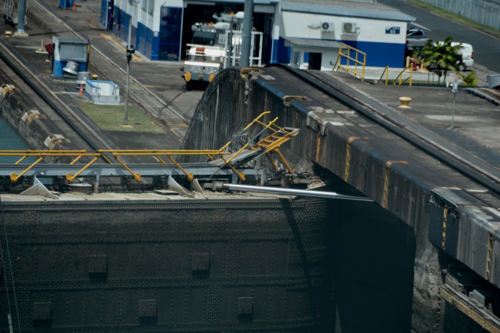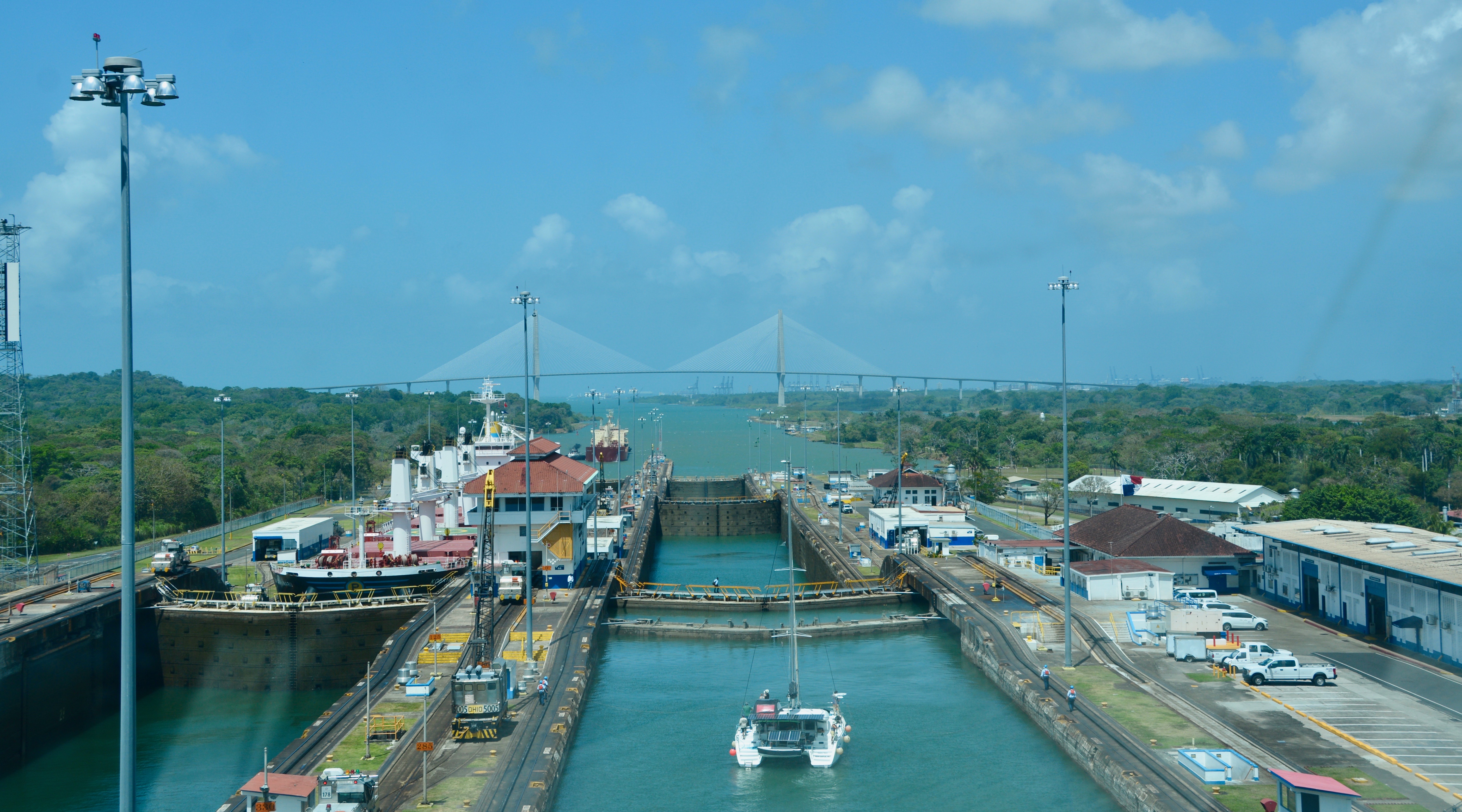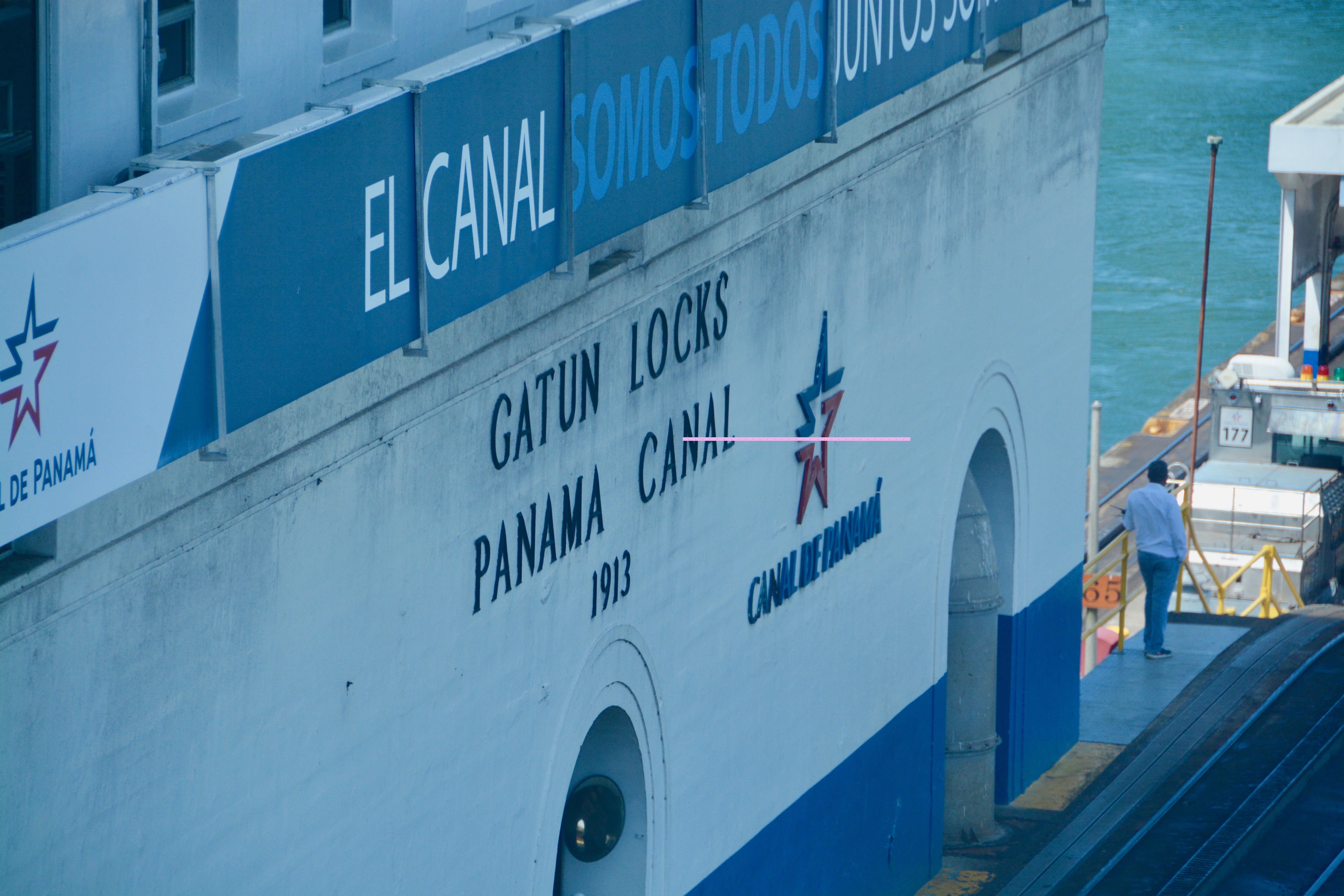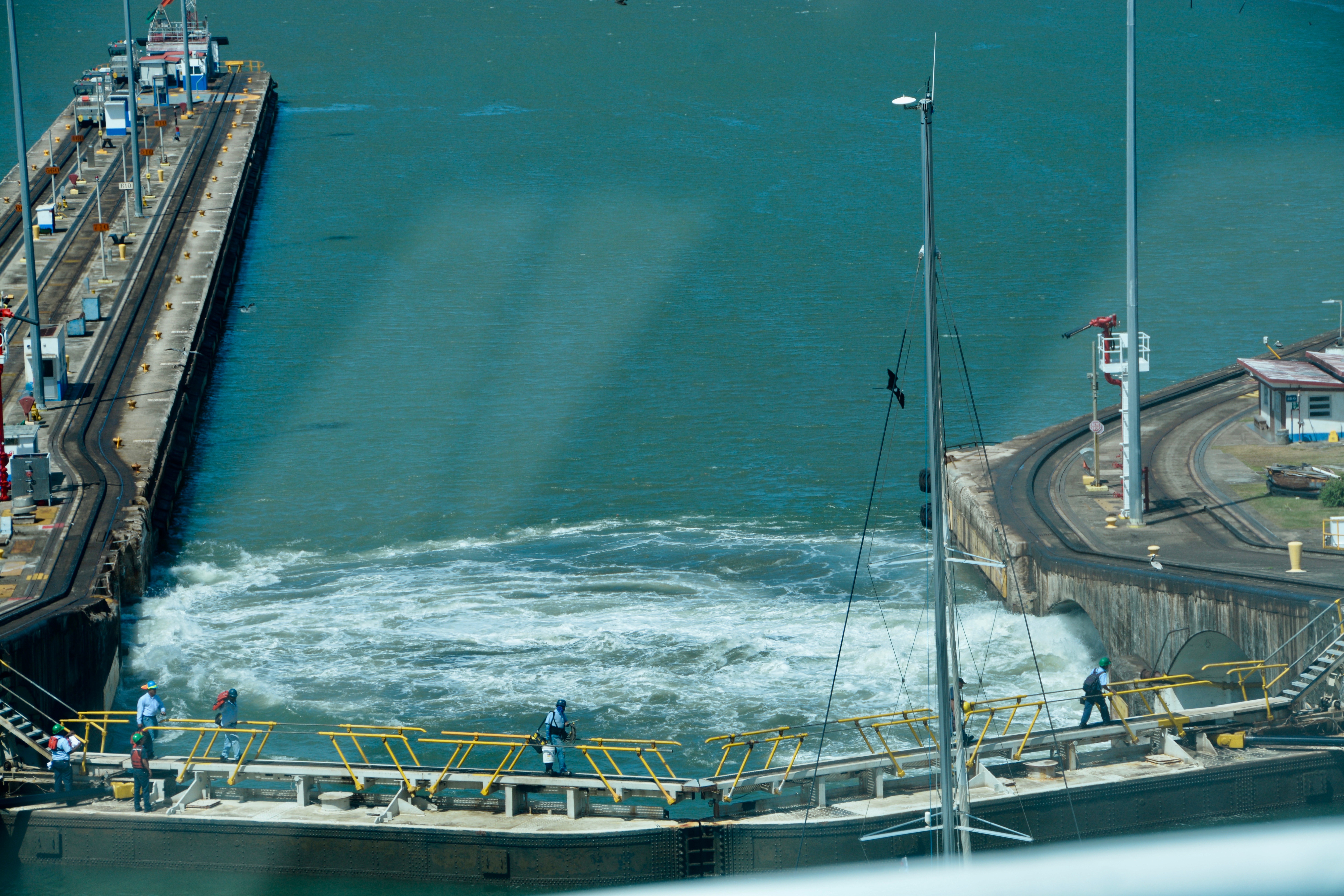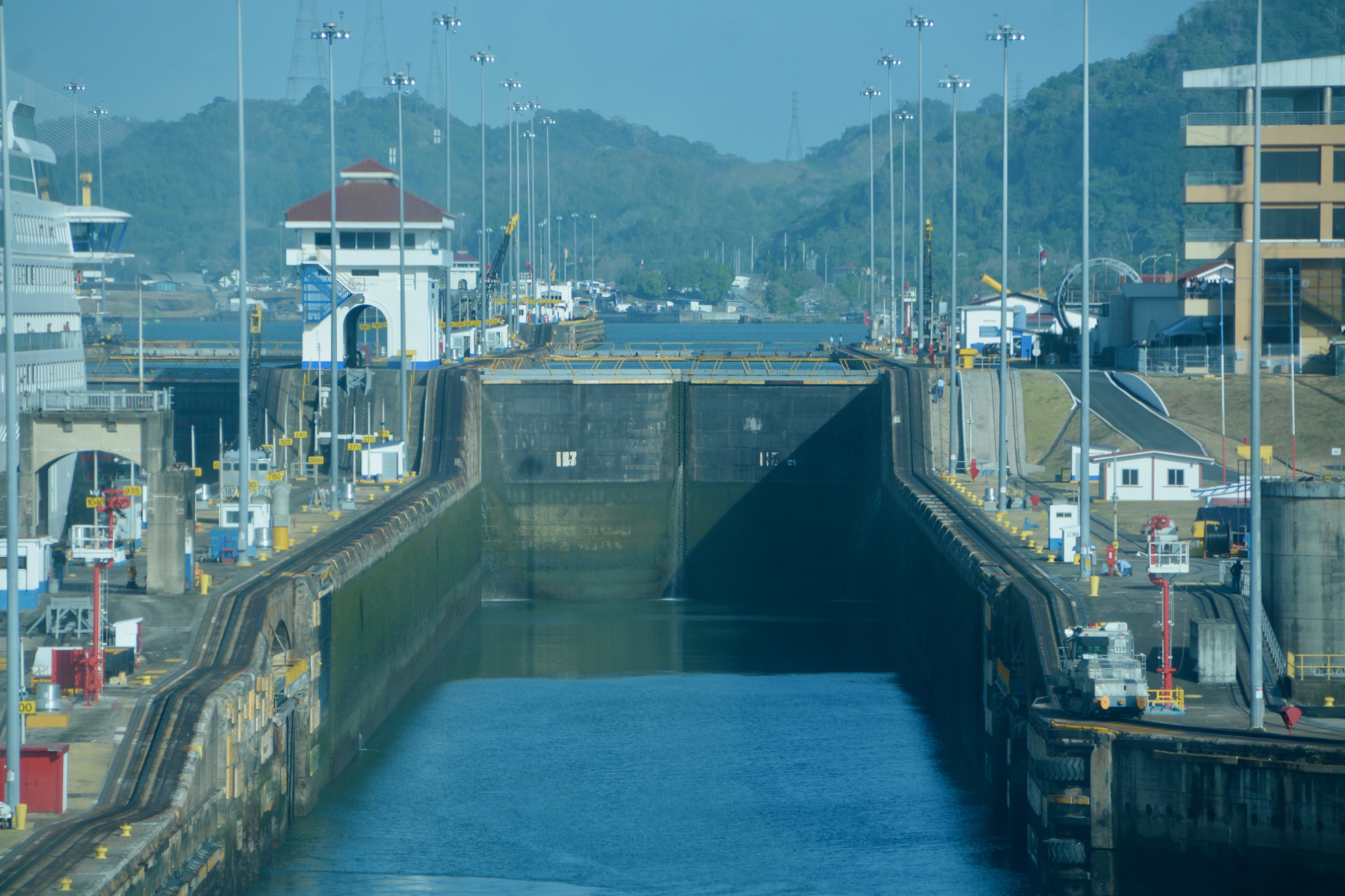 It didn’t take long to reach the Pedro Miguel lock. Like Miraflores, it has two sides. However, this time there is a single lock on each side. Also, there is not one, but two gates at the end of the chamber. This is for added protection just in case the first one is breached or damaged. They don’t want the water to drain. There are spare gates, but the ones in place now are the originals.