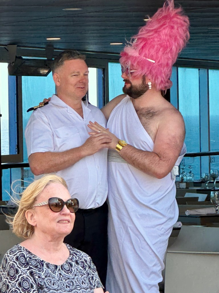 The day’s highlight was yet to come. Having crossed the equator the night before, the crew had a special ritual for those members who had not crossed before. Several crew members, including the environmental officer, were selected to stand before Neptune’s court in session on the pool deck. Loosely based on a navy hazing ritual for those crossing the equator for the first time, the crew members had to appear before Neptune, a female member of the entertainment team wearing a white beard and holding a cardboard Trident and “his” queen, the rather hairy Assistant Cruise director dressed in a short toga and a pink beehive wig and crystal sunglasses. Each of the selected crew had to kiss a really large fish and then submit to “the doctor”. The doctor covered them in colored foam (particularly difficult for the officers in their white shirts) and they were then thrown into the pool.