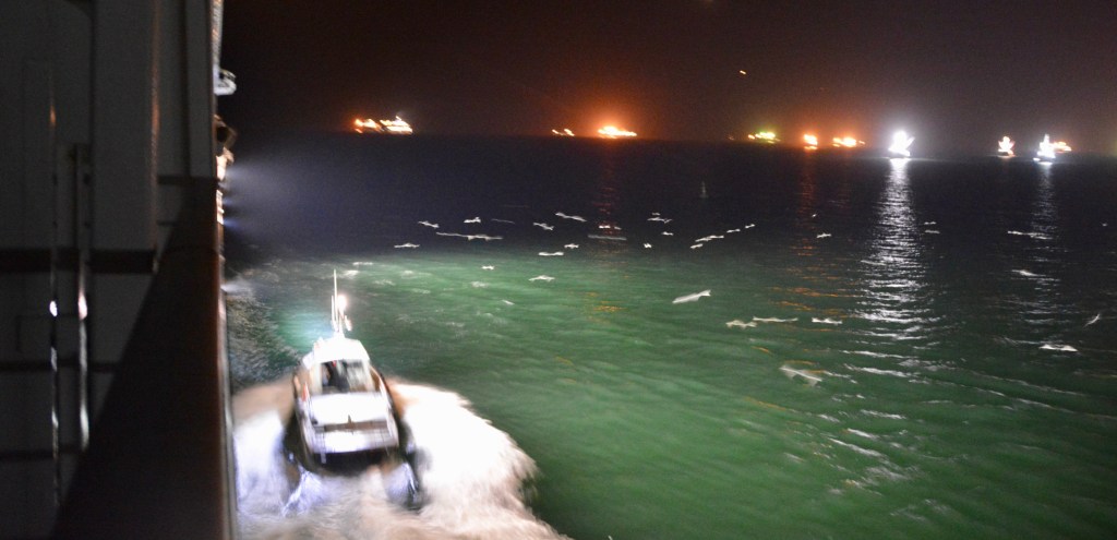 We will have a different pilot and different line workers take us through the third set of locks. The ones on board now leave us here and return to Miraflores. I saw the pilot boat first. Later, a second boat came to pick up the line workers who helped with attaching the mule lines to the ship. There were 20 line workers. Yes, Natasha counted.