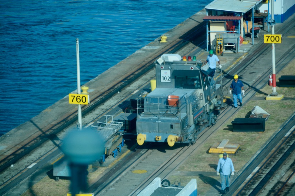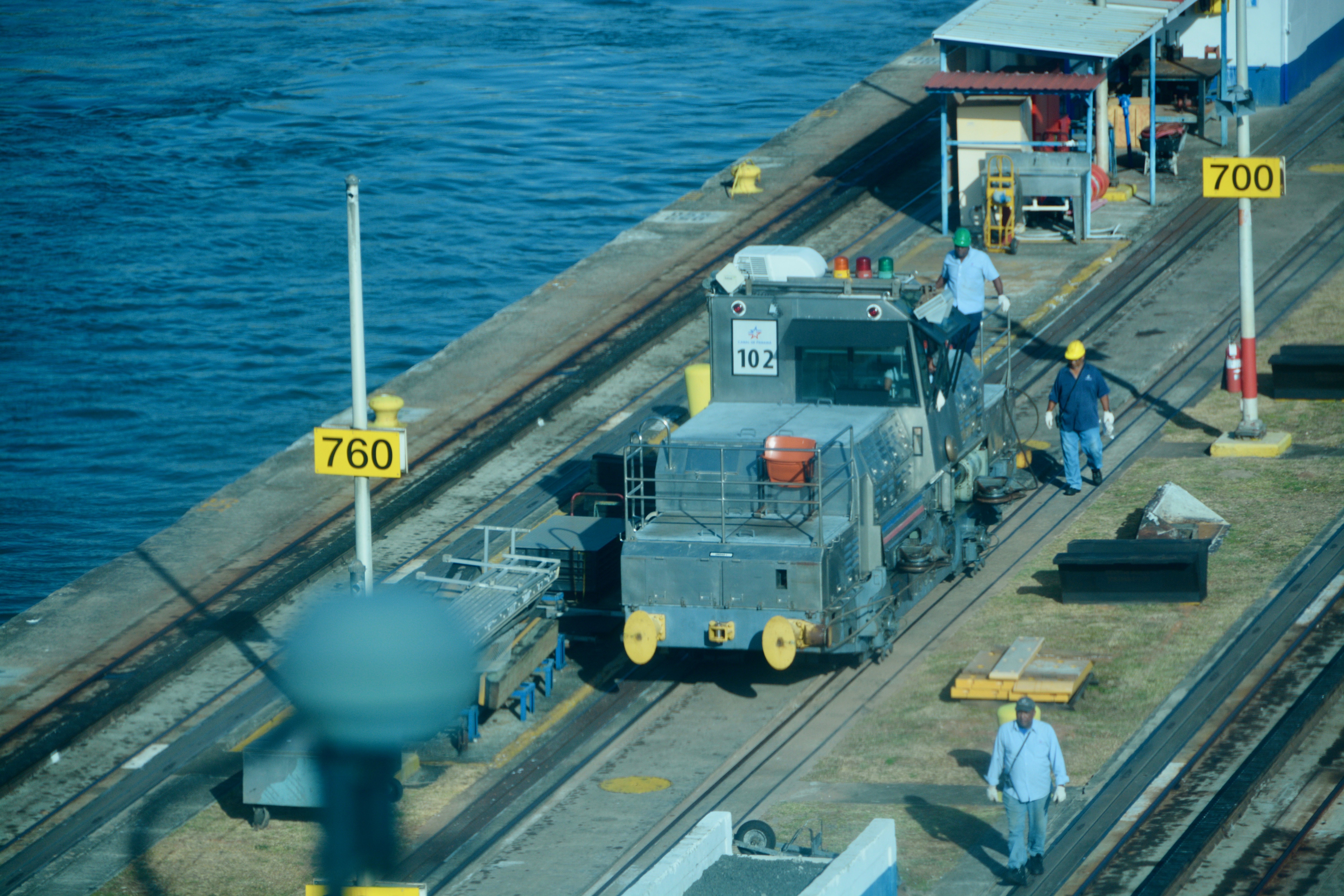 We are attached to “a mule” on each side, although we reached the inner (left in our case) mule sooner because the wall between the two locks jets out farther than the outer wall. Americans call the machinery mules, a reference to the animals that pulled boats through the Erie Canal. The Panamanians call the mules electric locomotives, a more accurate term. The Mules just help with alignment and hopefully keep you from hitting the front wall/gates. The ship is really doing the work, supplying 99% of the power to move forward.