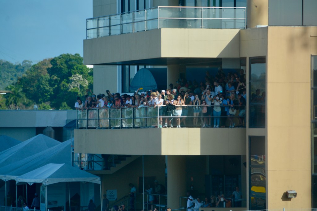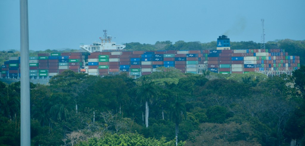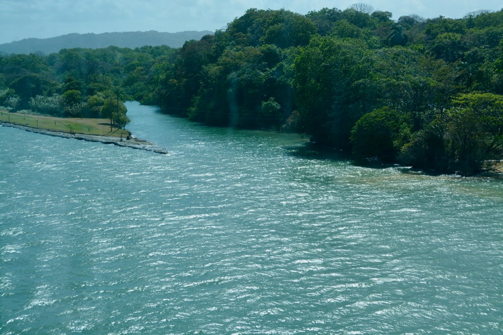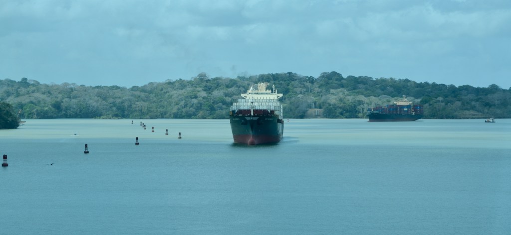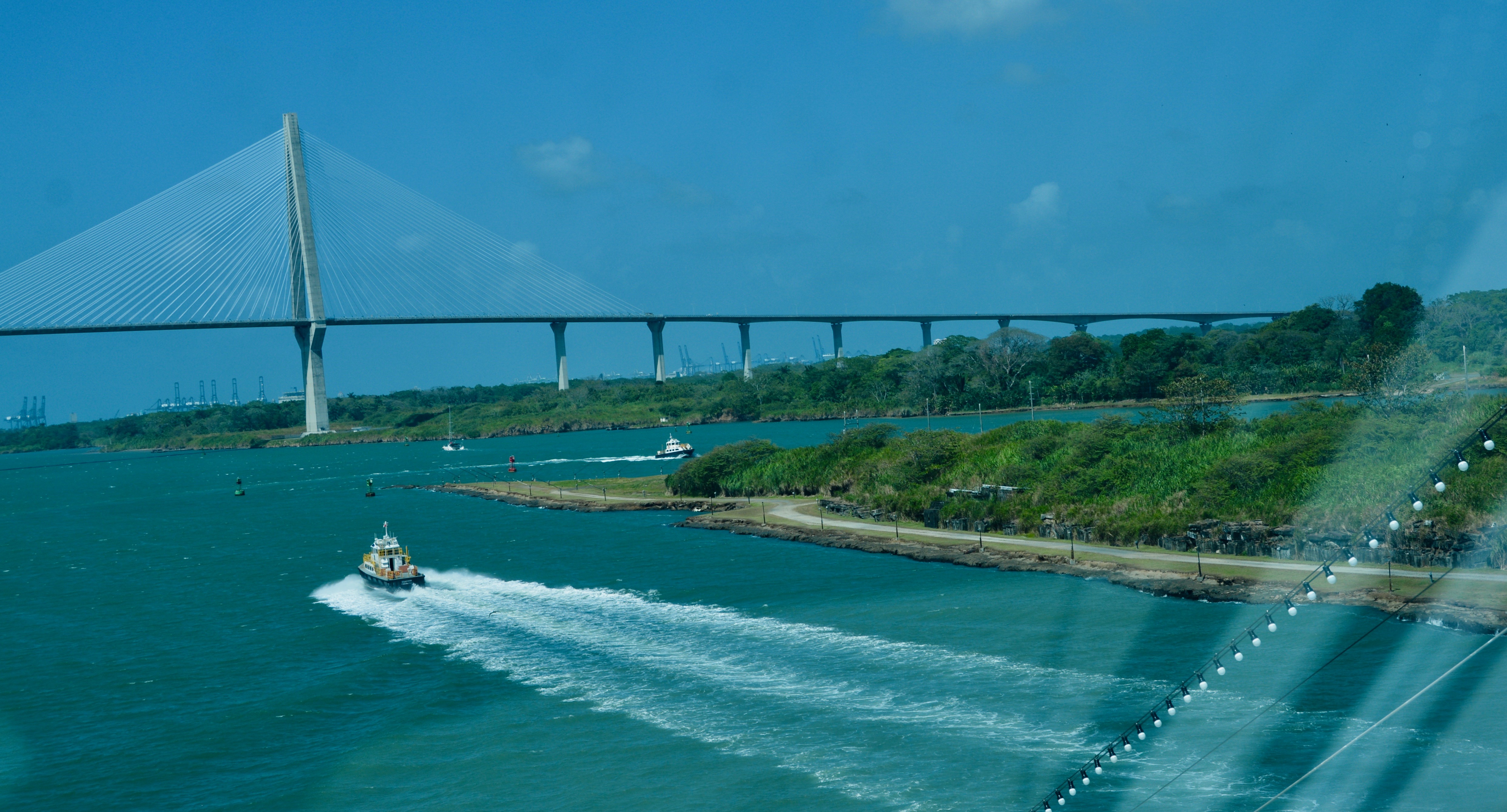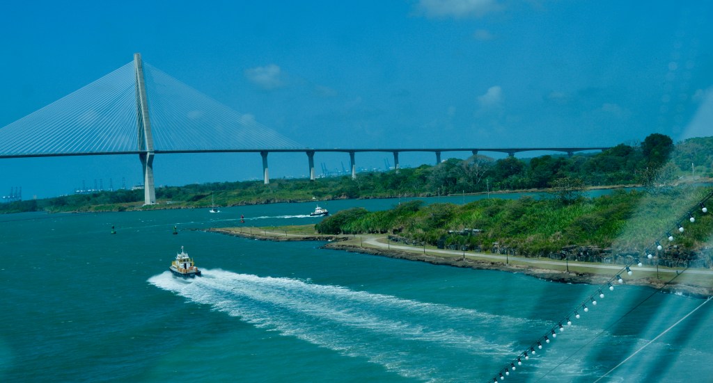 We reached the second lake, Gatun Lake. It is rather large, especially in comparison to Miraflores Lake. Our guide once again commented on how swiftly we were moving through the isthmus. We saw another cruise ship, the huge Celebrity Edge in the lake. The Edge and ships like it have to go through the new third lane; it is too large for the older locks. Additionally, like the Queen Mary, it has to turn around and go back to the Caribbean Ocean. This is what our guide called an “inee, outee”, or partial transit. The primary reason these huge, tall ships have to turn around is because they cannot fit under the Bridge of the Americas at the opposite (Pacific) end of the canal. A partial transit costs the same as making the full transit.