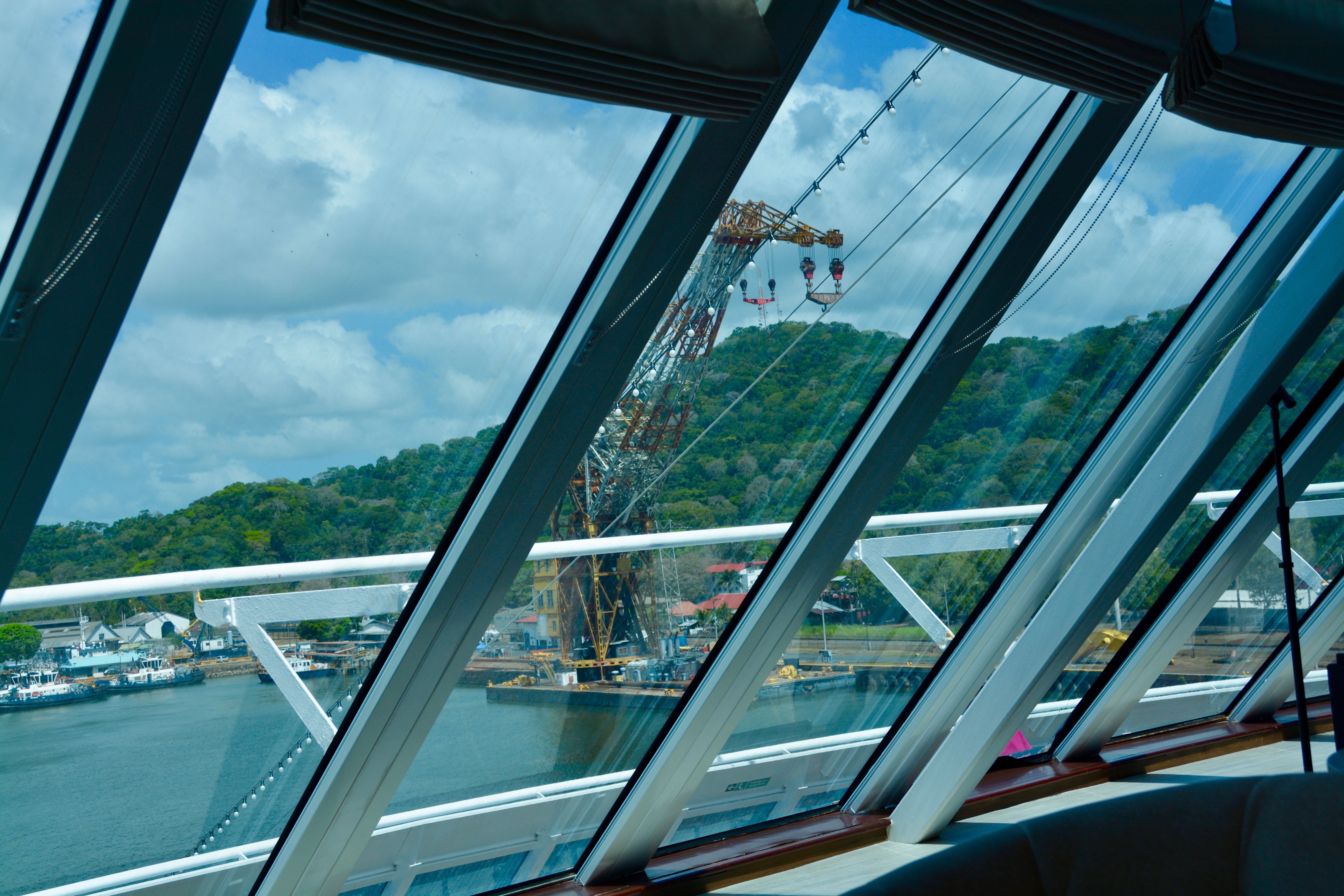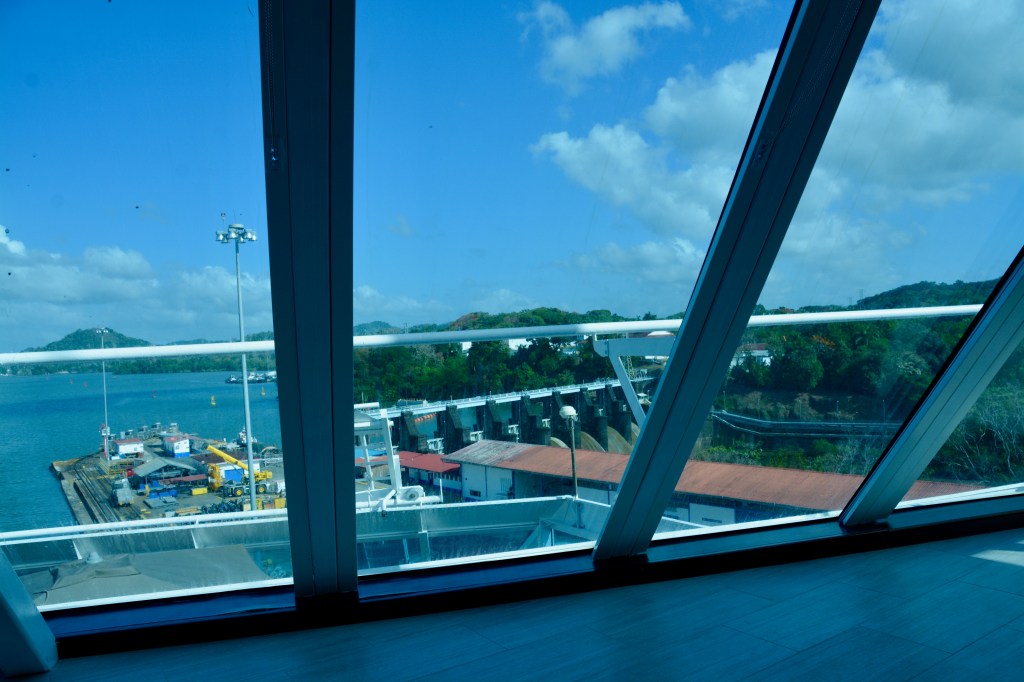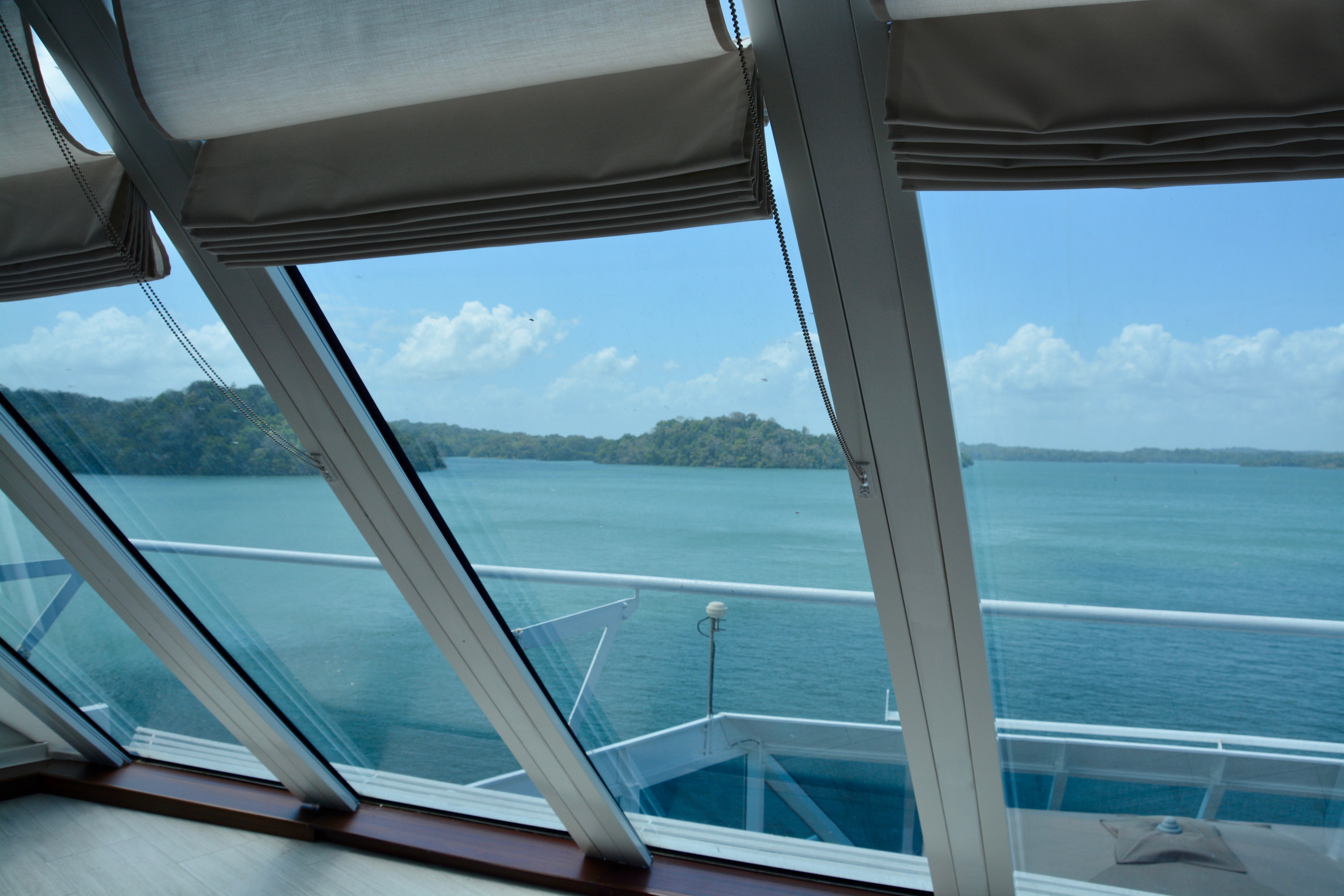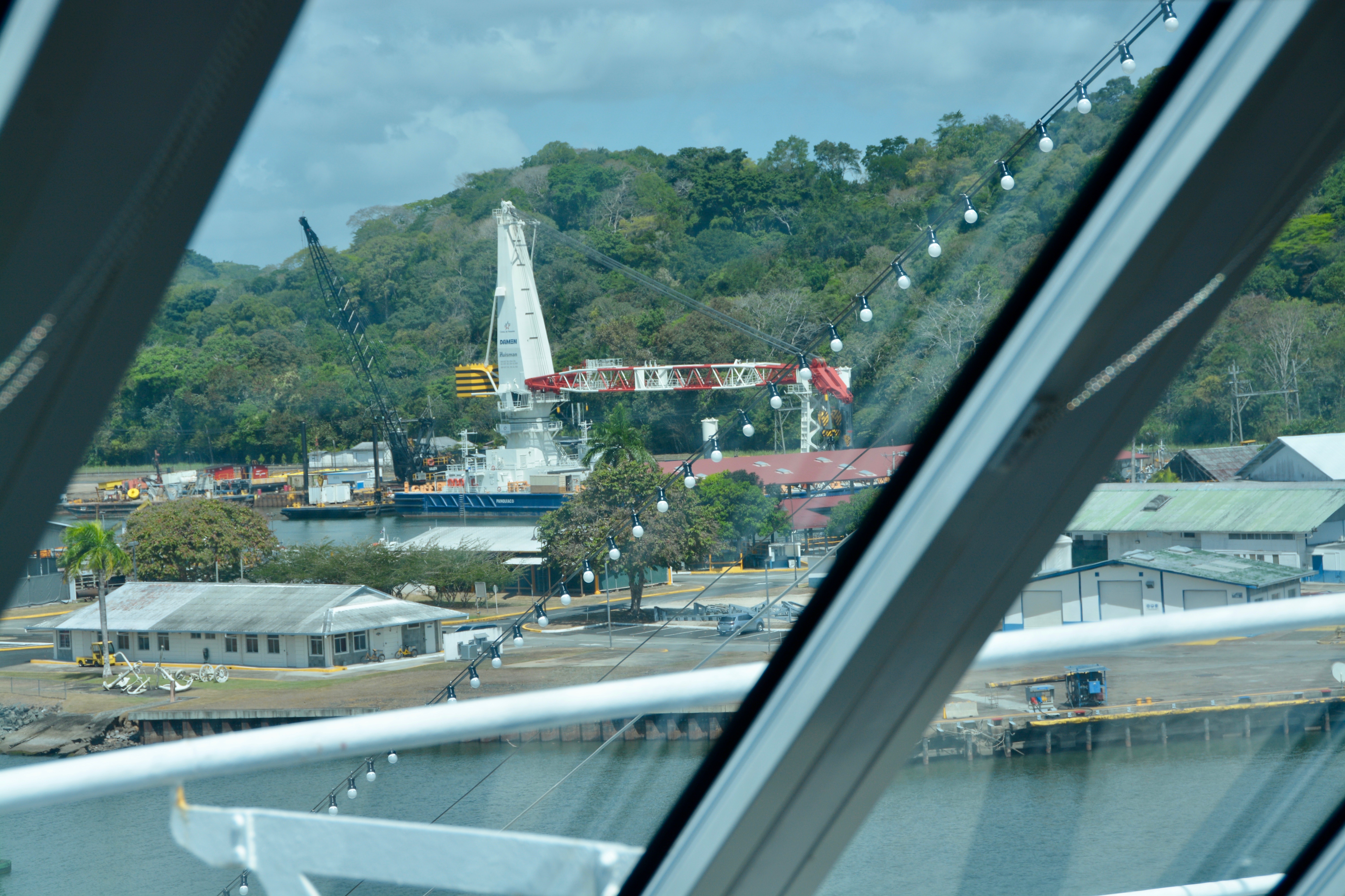 Looking worse for the wear after an early morning wakeup, Boris and Natasha approach the Gatun Locks in the Panama Canal. The view is from The Living Room of the Azamara Onward.
