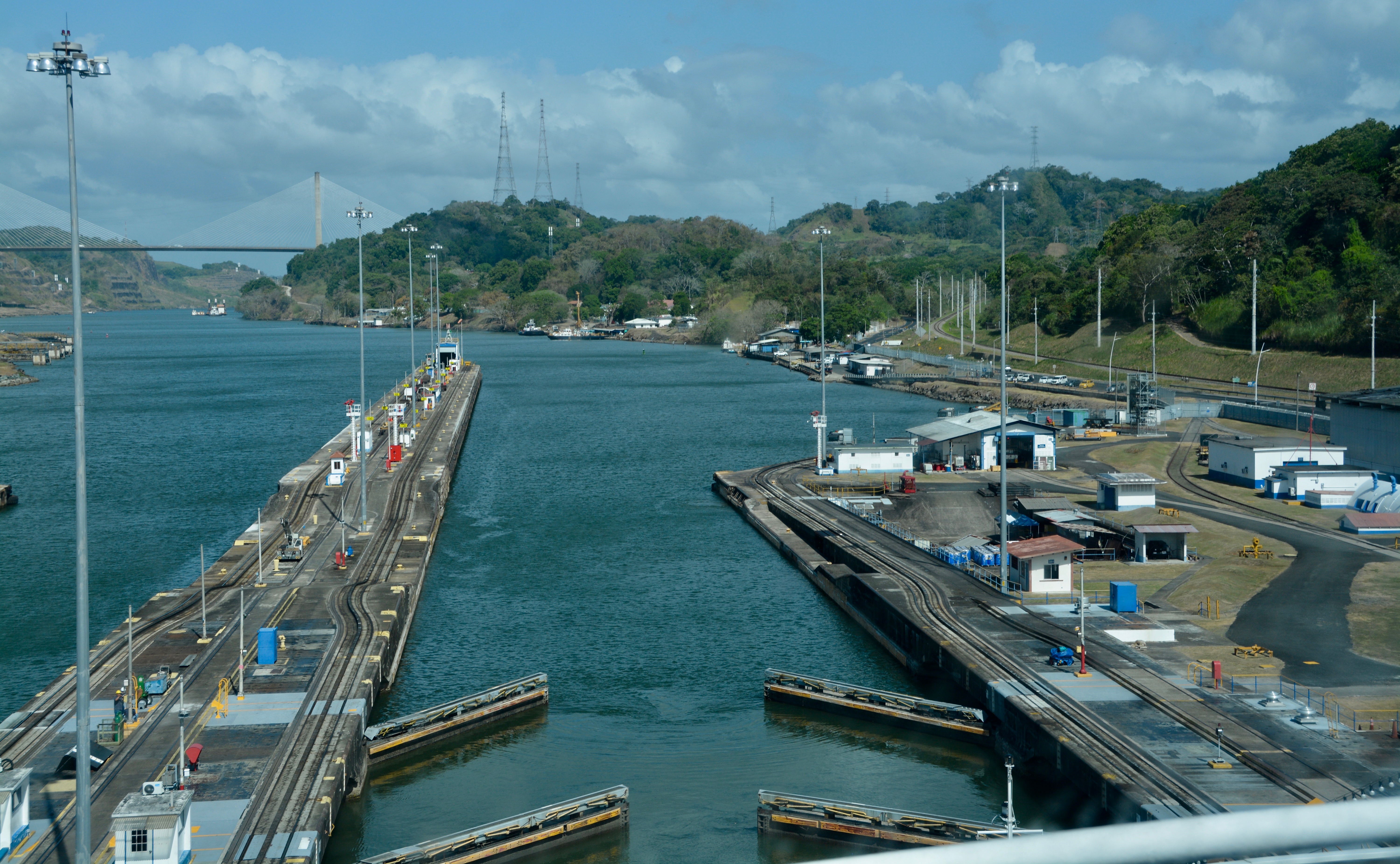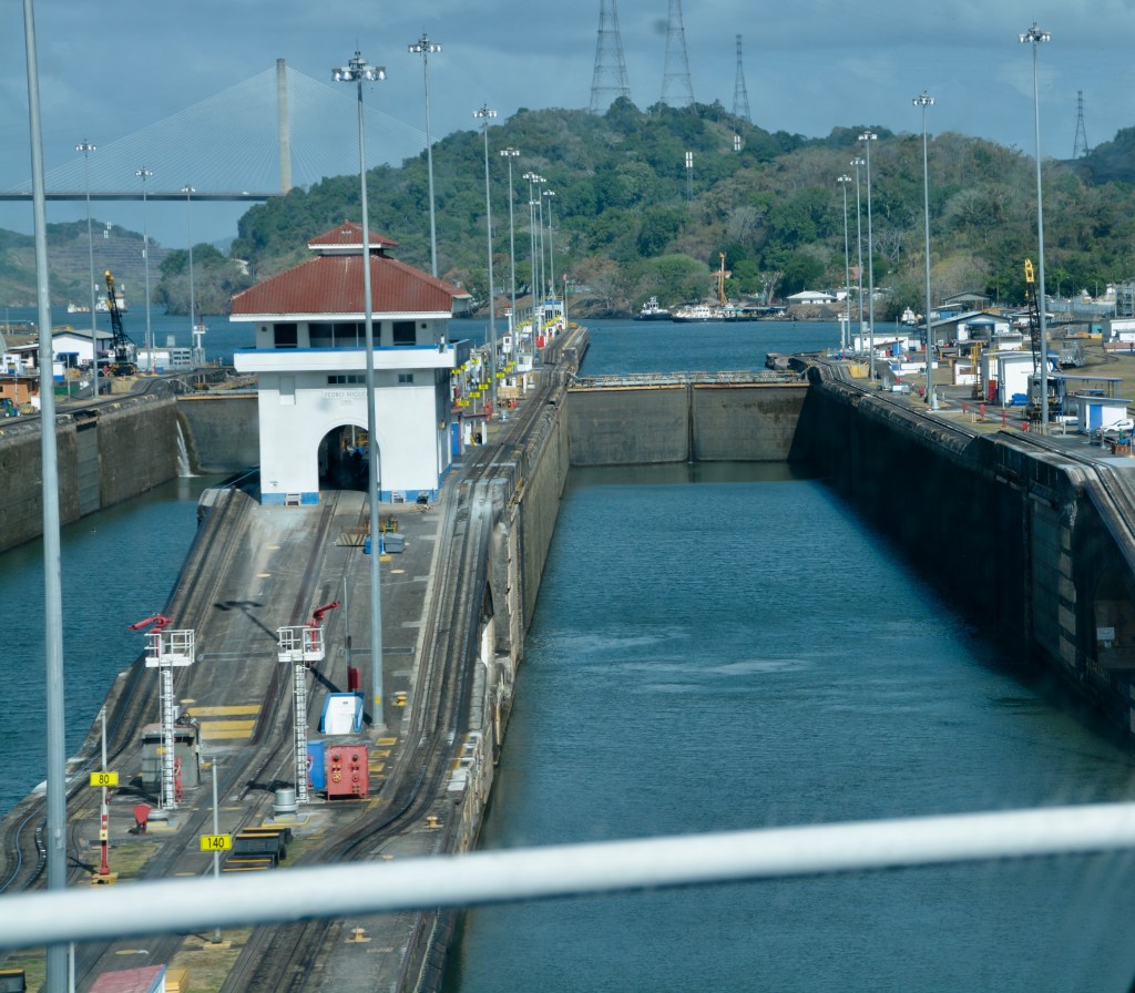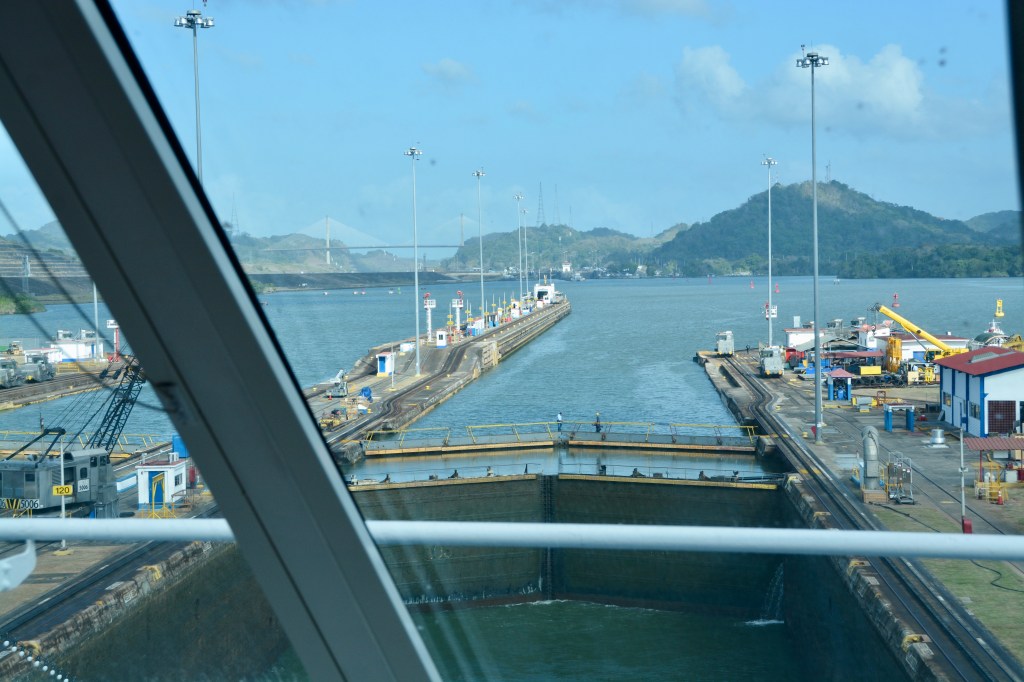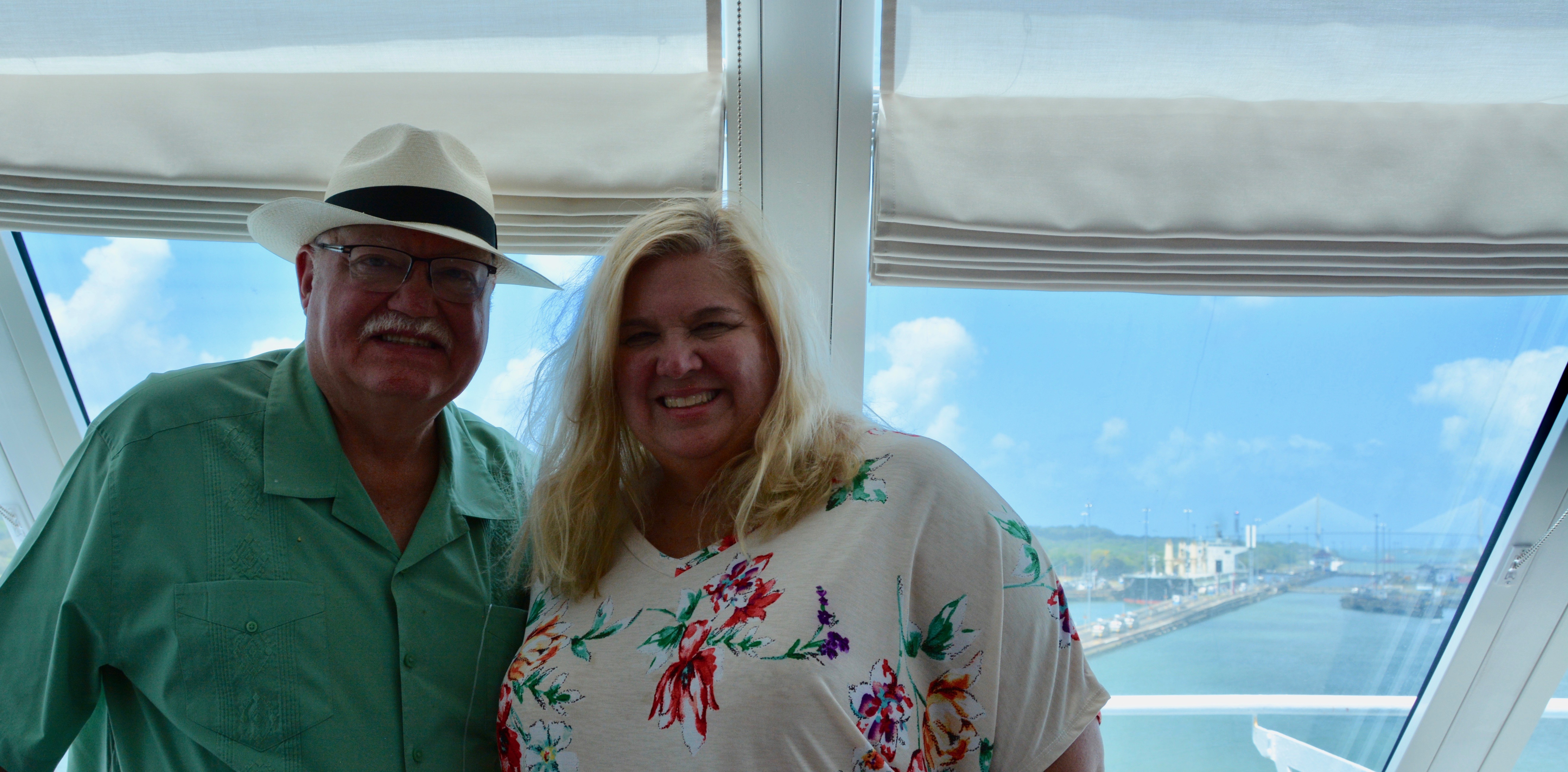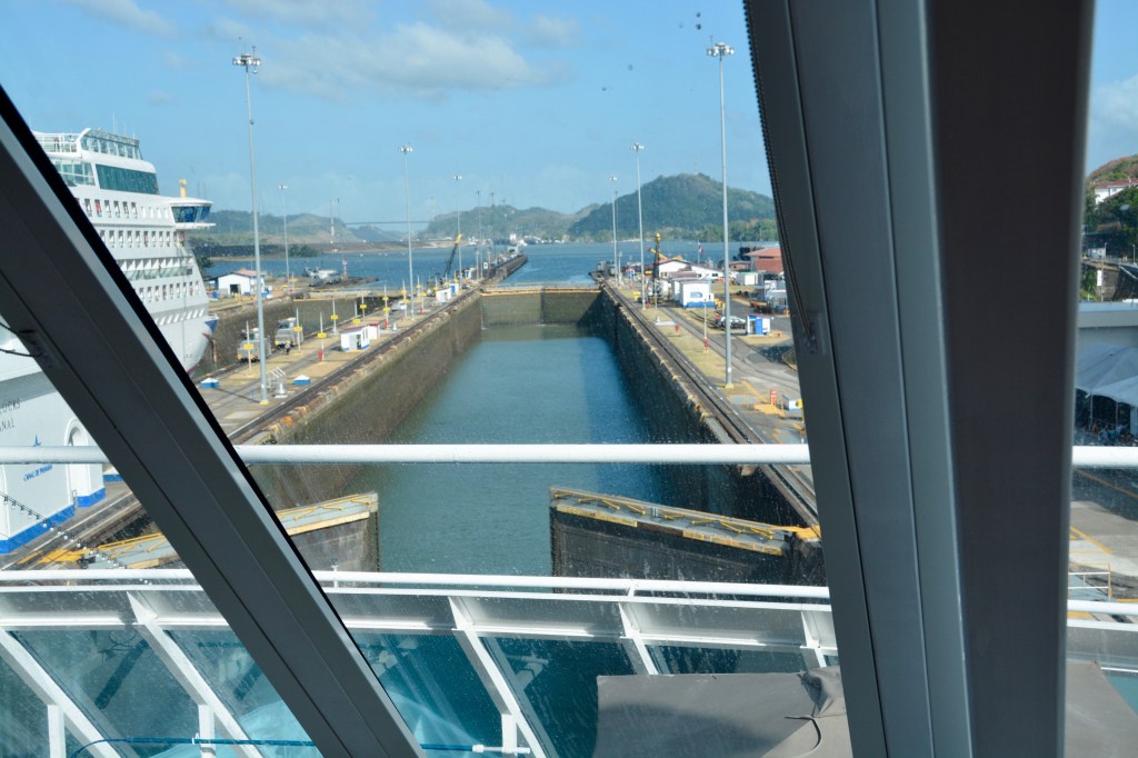 Looking worse for the wear after an early morning wakeup, Boris and Natasha approach the Gatun Locks in the Panama Canal. The view is from The Living Room of the Azamara Onward.