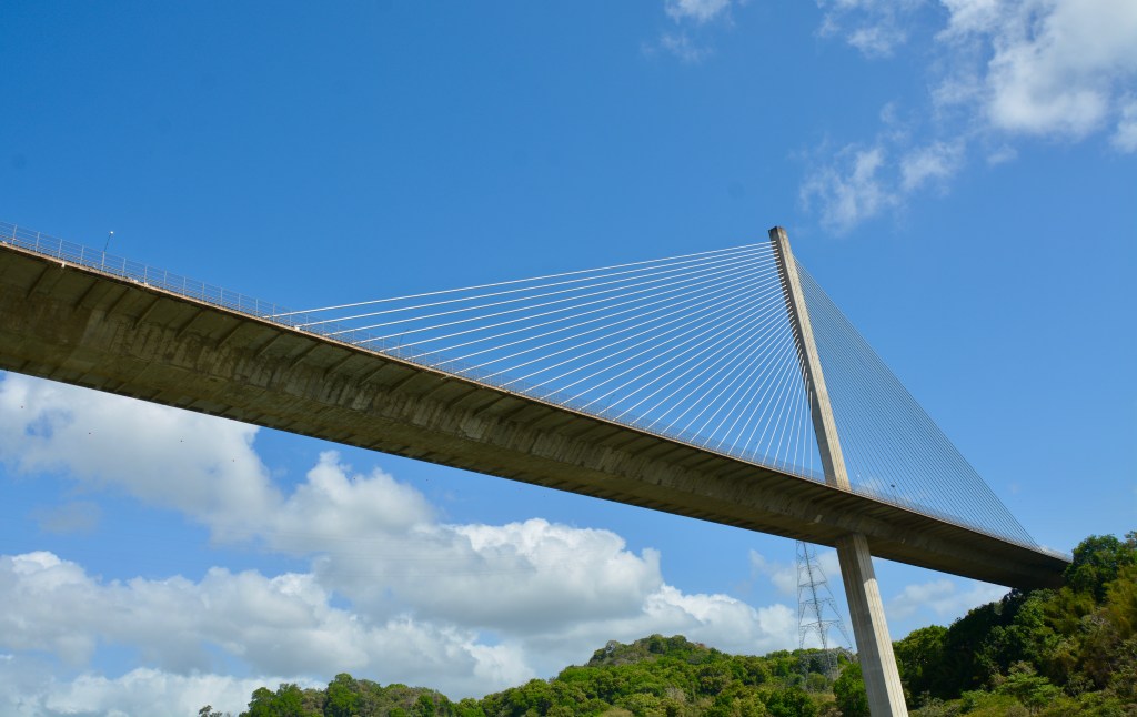 As we moved toward the open sea to our left side (port), we could see the remains of the French canal. For more about its history, check out yesterday’s post. On the right side (starboard), we passed the exit to the third lane. Then just ahead is the Atlantic Bridge, one of the largest cable-stay bridges in the world. In the distance were loading/unloading cranes of the Montecristi seaport.