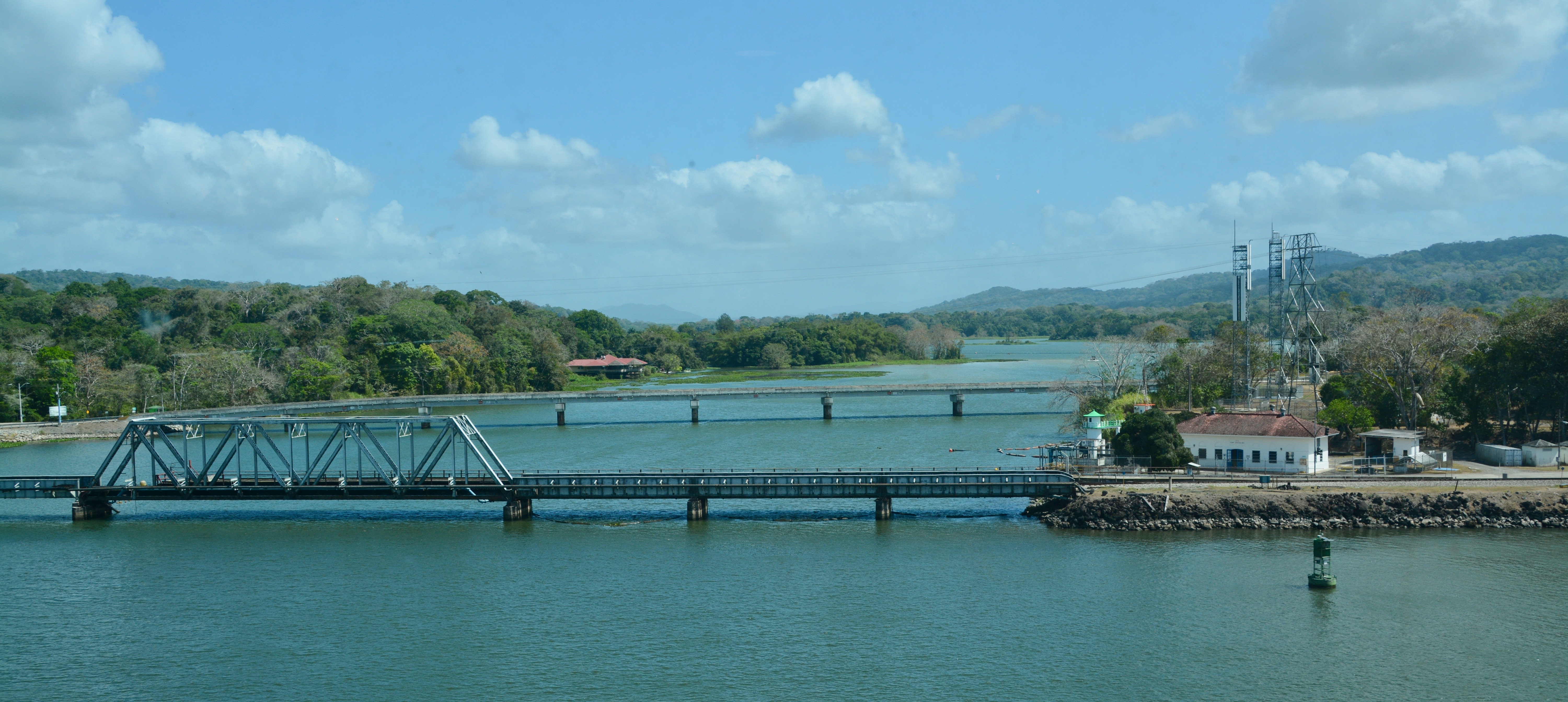 We came out of the Culebra Cut and into the Gamboa Reach. On the starboard side were two bridges over the Chagres River. There used to be a single shared bridge with a traffic signal; the bridge was used by trains and vehicular traffic. The train always got precedence. Now there is a separate vehicular bridge, farther from the canal, but still visible.