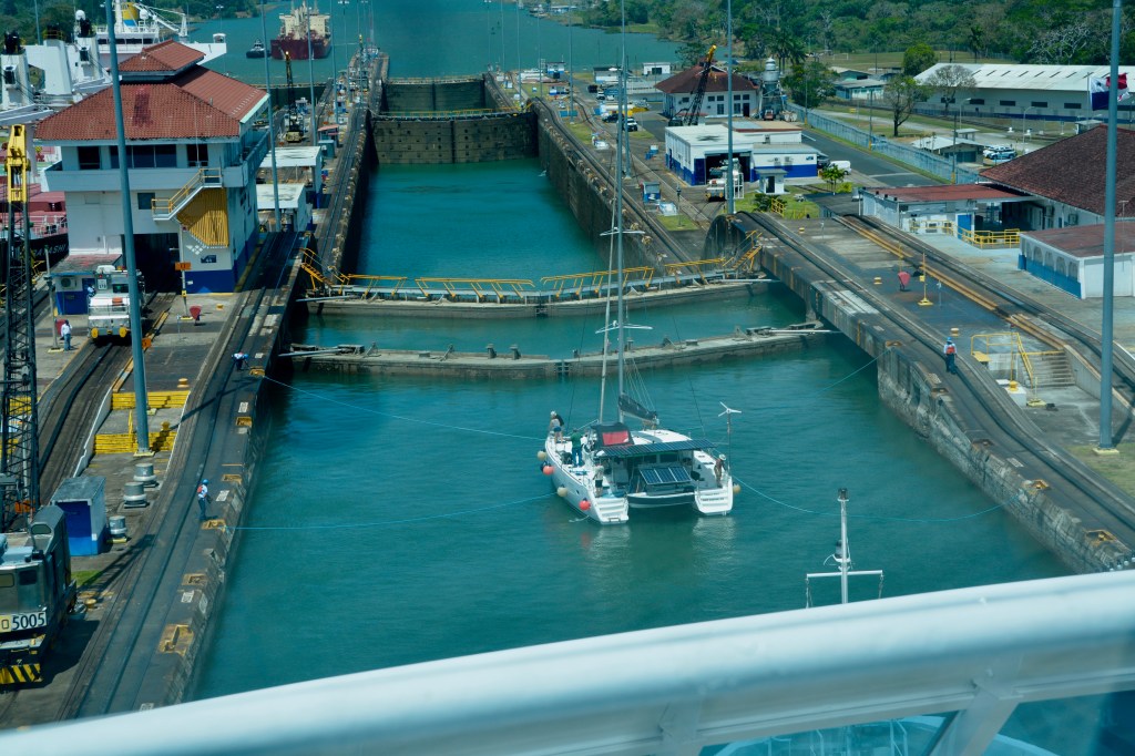 The Gatun Locks at the Atlantic end of the canal once again have two lanes. This time each lane has three locks, each with double gates. We made three steps up as we traveled northbound leaving the Pacific, two steps up at the Miraflores Locks and one step up at the Pedro Miguel Lock. We will take three steps down in the Gatun Locks. For this series of locks we have a catamaran in the chambers with us. I don’t think I would want a cruise ship looming over me in the same lock chamber. Our speaker estimated that it was costing the catamaran sailors $1,000-$2,000 to go through the canal