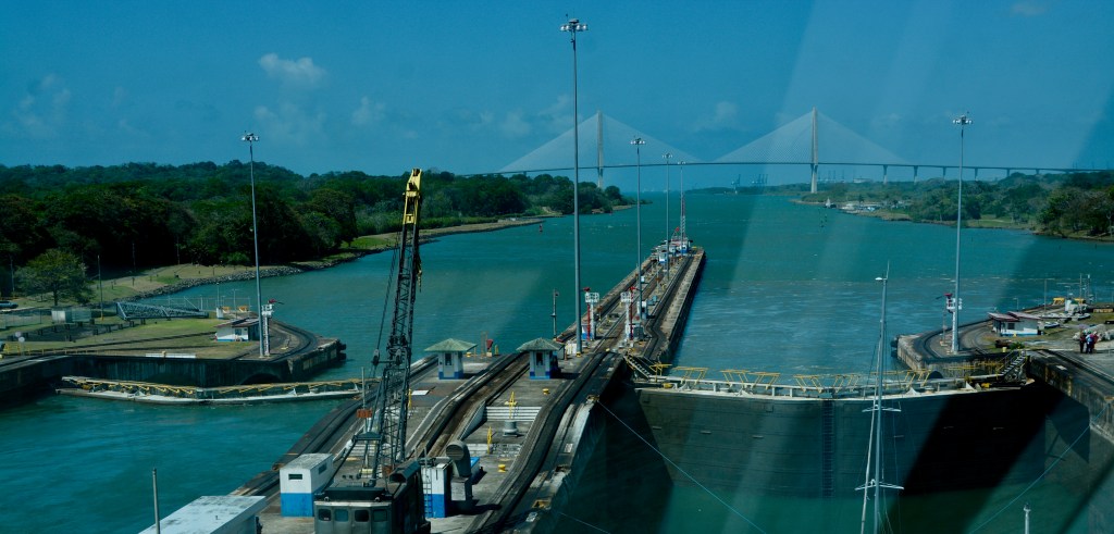 What I really hadn’t realized before preparing for this trip is that passage through the Panama Canal, at least passage through the original lanes, is actually transit through a series of locks and two lakes. Our passage from the Pacific begins at Miraflores where there are two lanes and a two-lock passage. The oceans are at different levels, but the lakes are actually the high-water point of the transit. The major flaw in the French attempt to put a canal in Panama was assuming they could do it at sea level as opposed to using the lock system.