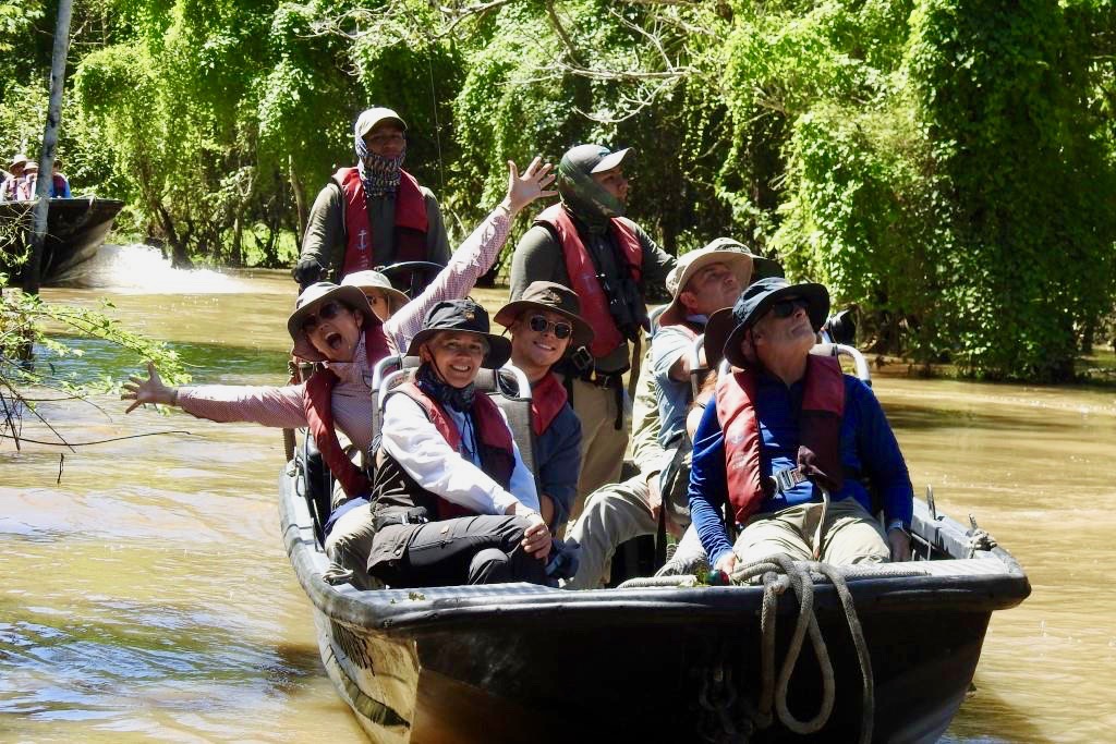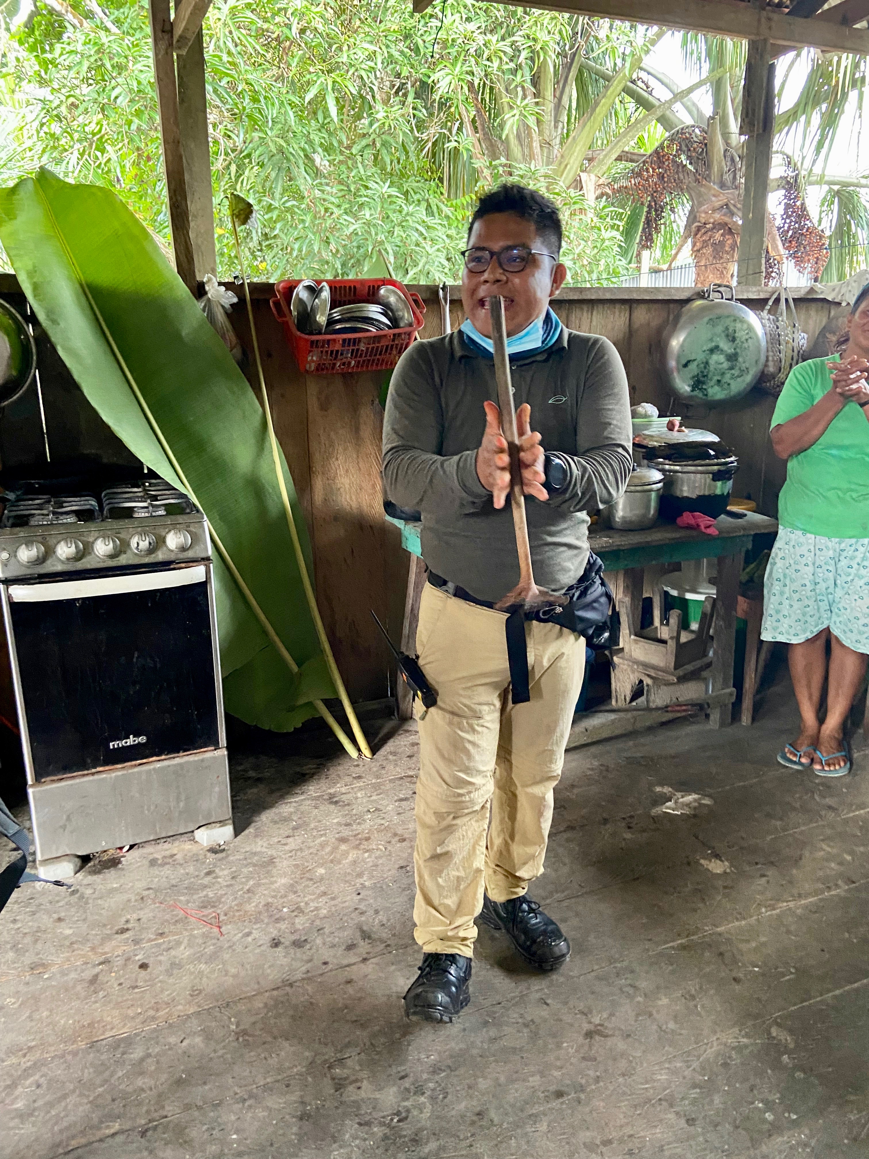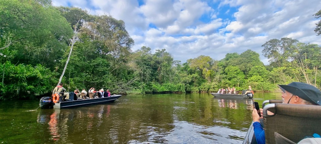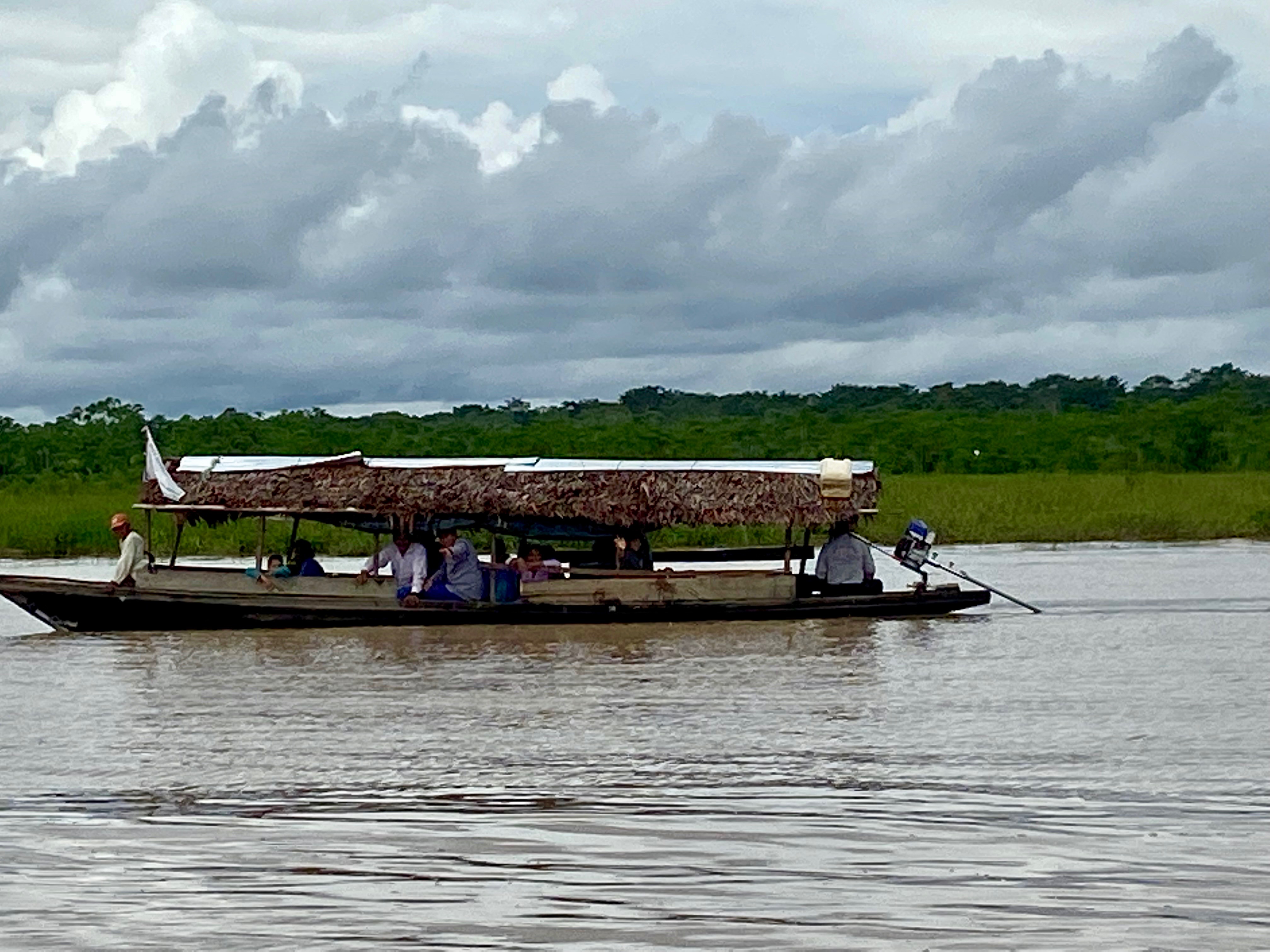 We saw water taxis out on the Amazon transporting people from one community to another. Many areas are only accessible by water. Speaking of hitching a ride, Boris raised the bar today. After a series of cricket ride alongs, today it was a striking blue butterfly that landed on his hat and made the morning journey with us.