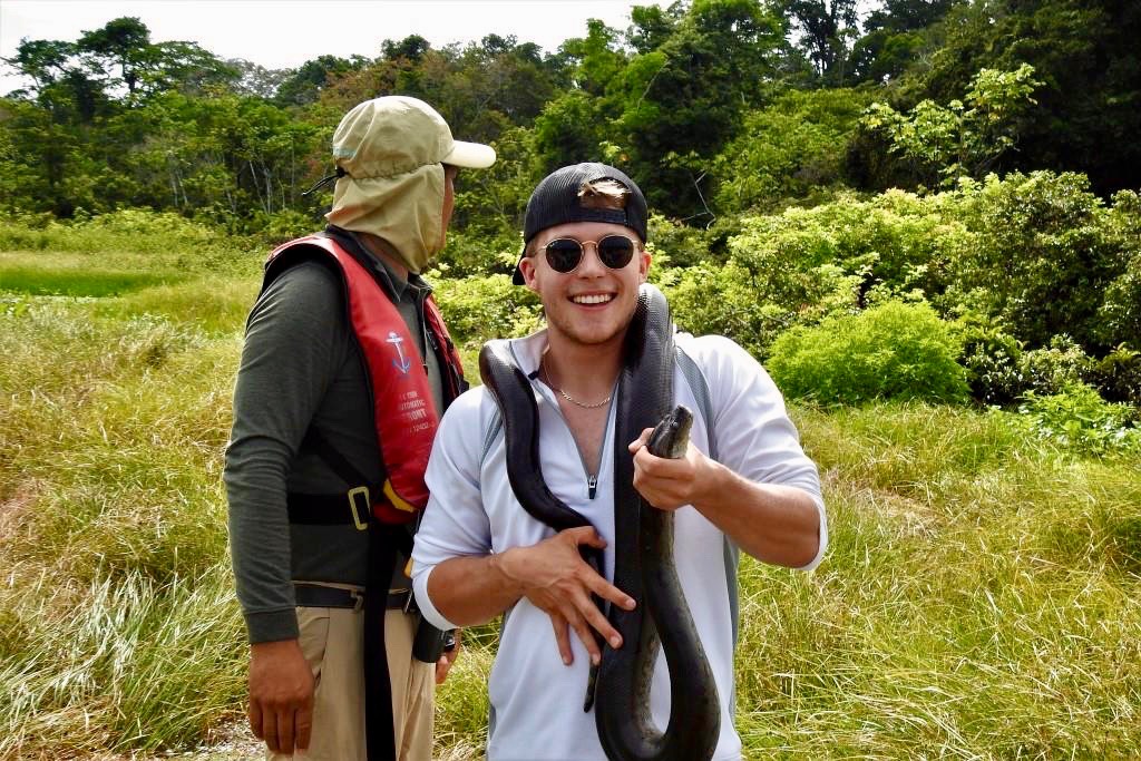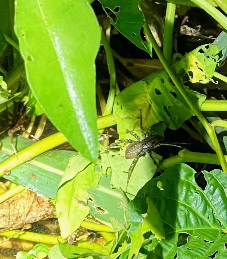 Caimans are “species of Central and South American reptiles that are related to alligators and are usually placed with them in the family Alligatoridae.” Brittanica. The name is sometimes spelled cayman, like the Caribbean island. We found one small and one medium caiman. I got to hold them both; Boris chose not to. Everything we caught was returned to the water.