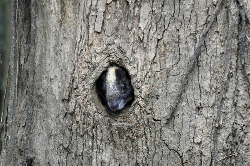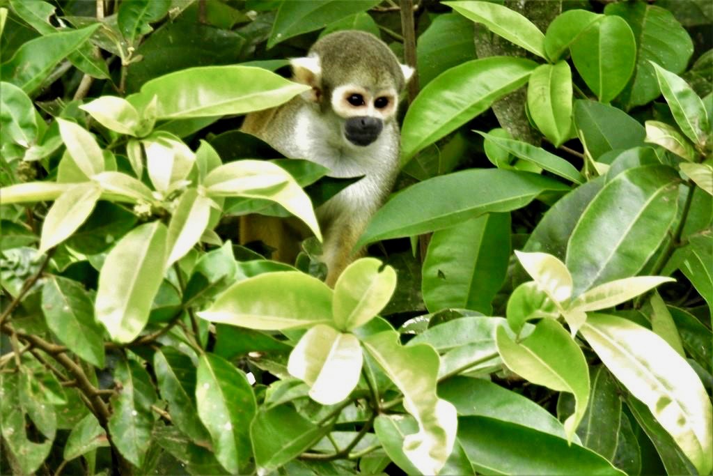 Most days we enjoy the play of the plentiful squirrel monkey. Today, we also saw the saddleback monkey and the black tamarin monkey, a small monkey with a white face. The hollowed out spaces in the trees were hiding places for some wonderful animals. On our first evening out, we saw three owl monkeys hiding in a tree. One of our big finds today was a kinkachu with its dog-like canine teeth. Like the owl monkey, it is nocturnal.