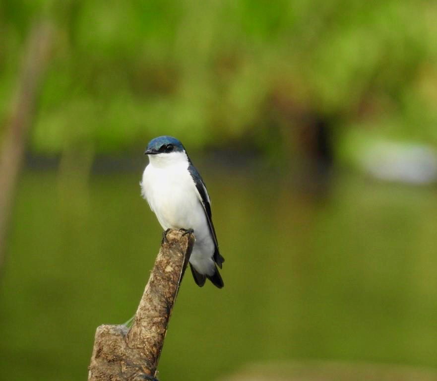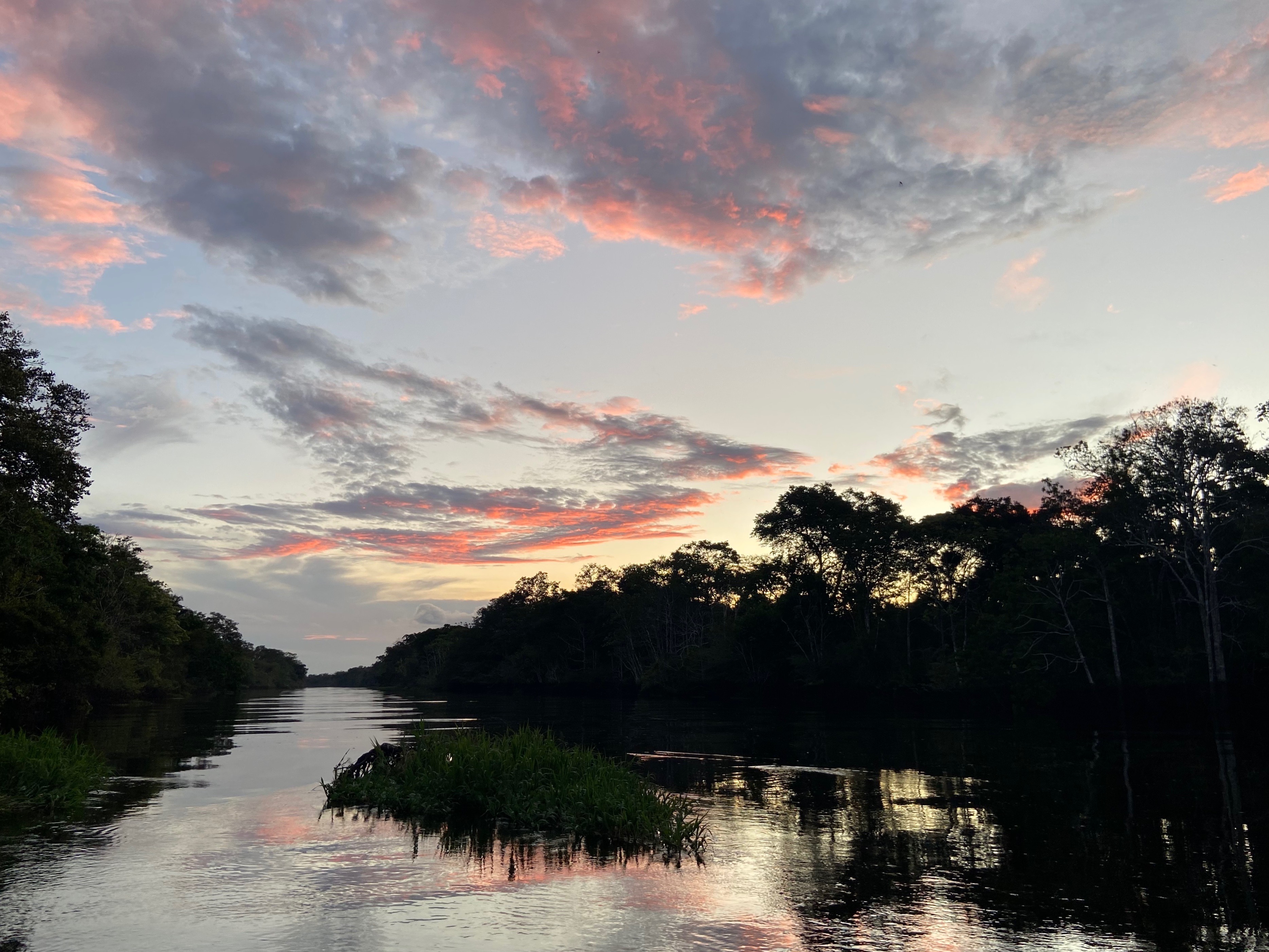 Late afternoon, we headed out down one of the tributaries that line the Amazon River. Some of these tributaries are black water rather than the muddy brown water of the Amazon. It is a rather sudden change when they merger. The black water originates at a swamp, rather than coming from the mountains. “As vegetation decays, tannins leach into the water, making a transparent, acidic water that is darkly stained.” In contrast to the black water created by the tannins, when water runs down the mountains it collects silt that gives the rest of the Amazon its muddy brown color. The black water has a strikingly different PH balance. Pink dolphin mothers come to the black water just after giving birth while the baby is still attached by the umbilical cord. The water kills the umbilical cord causing it to fall off; the water then seals the hole. If you place a piece of red meat on a string in the black water it will be white when you pull it up; the water cooks it.