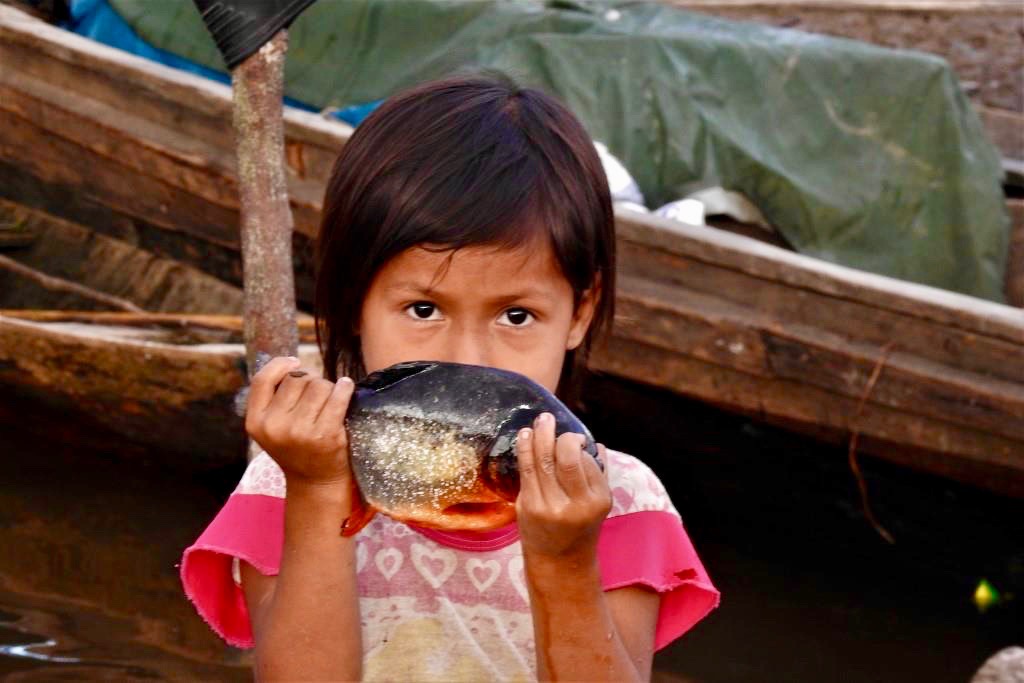 After a twenty minute ride down the tributary, we pulled into a creek and came across children out in canoes; they rowed their small narrow boats with a wooden paddle.. They were eager to show us what they had caught. Some had the iron armored catfish; other piranhas.