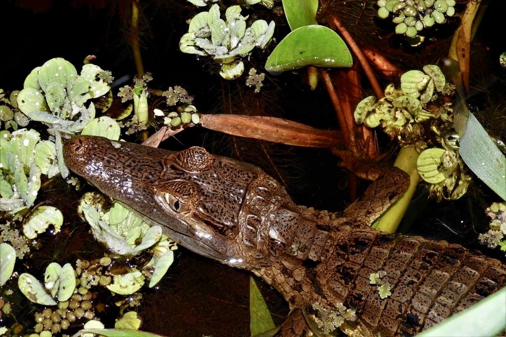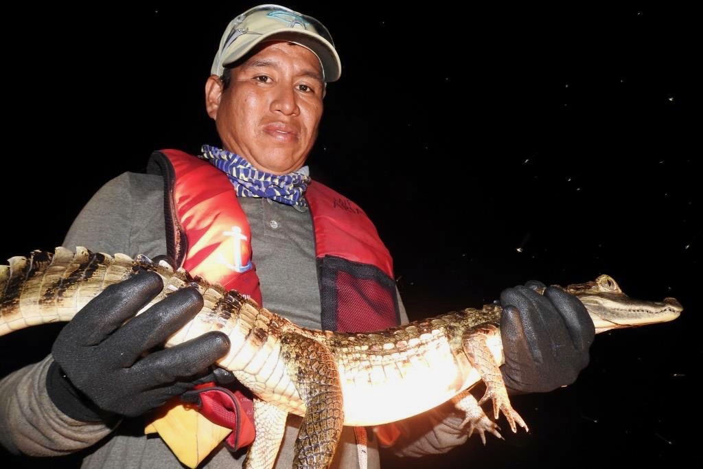 We are hunting for caimans tonight; that is why we are out after dark. Since the guides use a spot light, all kinds of creatures are attracted to the light. As we moved through the water, we wore masks and clear glasses to protect ourselves. The easiest way to spot the caimans is to look for their red eyes. Billy and Julio are the best spotters and we are lucky to be in Julio’s boat tonight. We found caimans in two patches of reeds.
