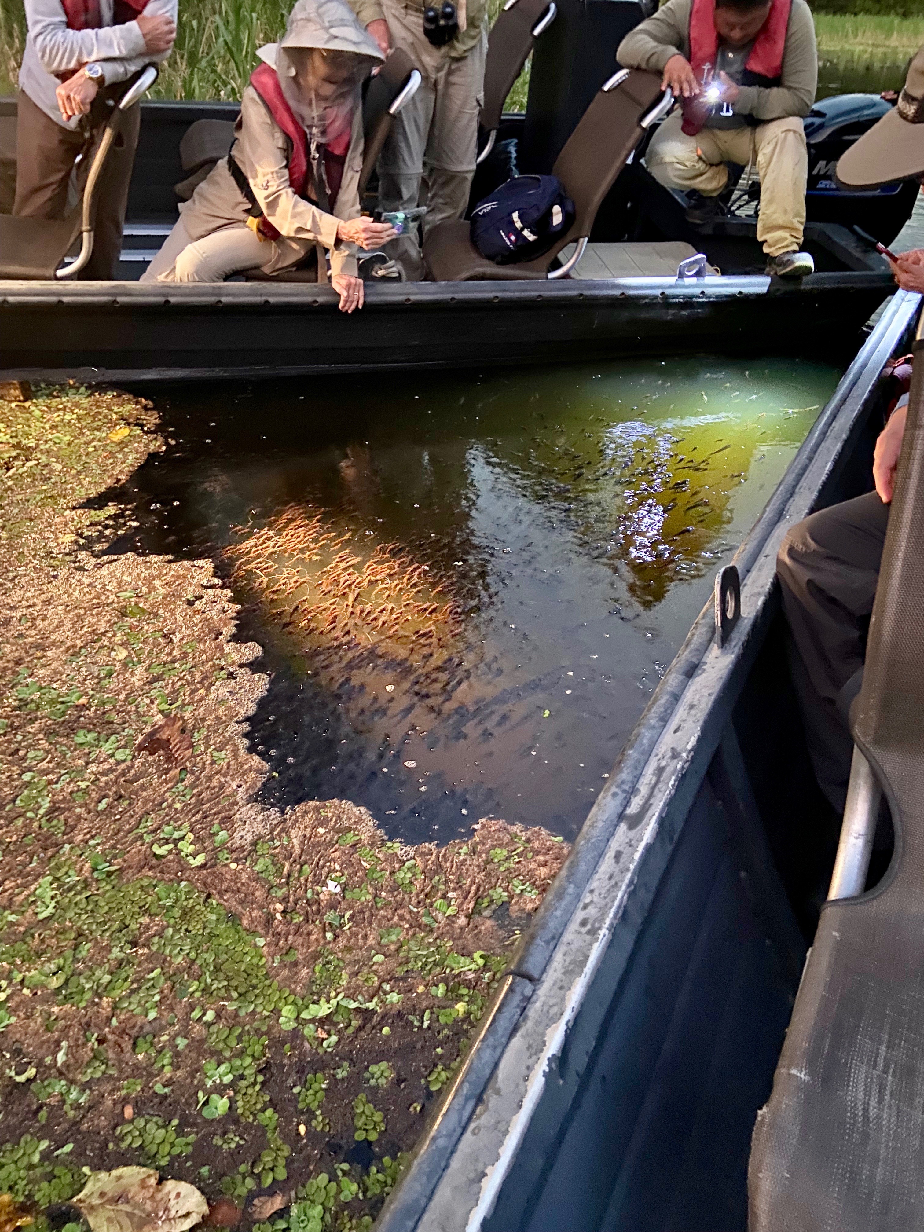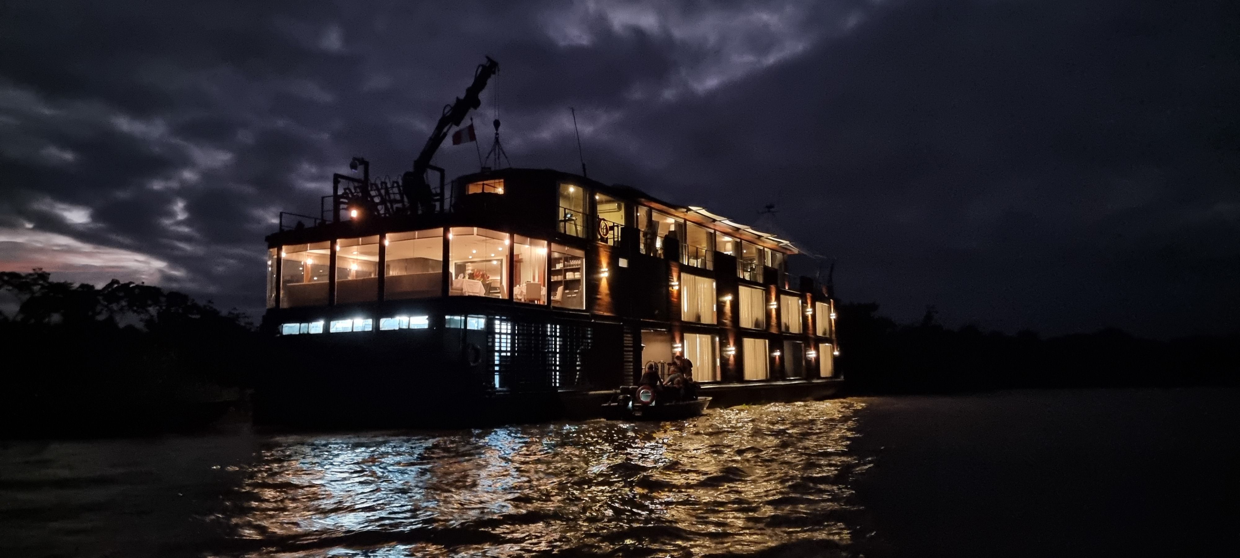 After our successful caiman hunt, we headed back to the Aria along the completely dark tributary and than the main river. Our guides moved the spot light along the shore looking for more caimans. Occasionally, they pointed out a large log in the middle of the river to our drivers. For almost the entire journey, the drivers navigated completely on memory not by sight. It was truly impressive.