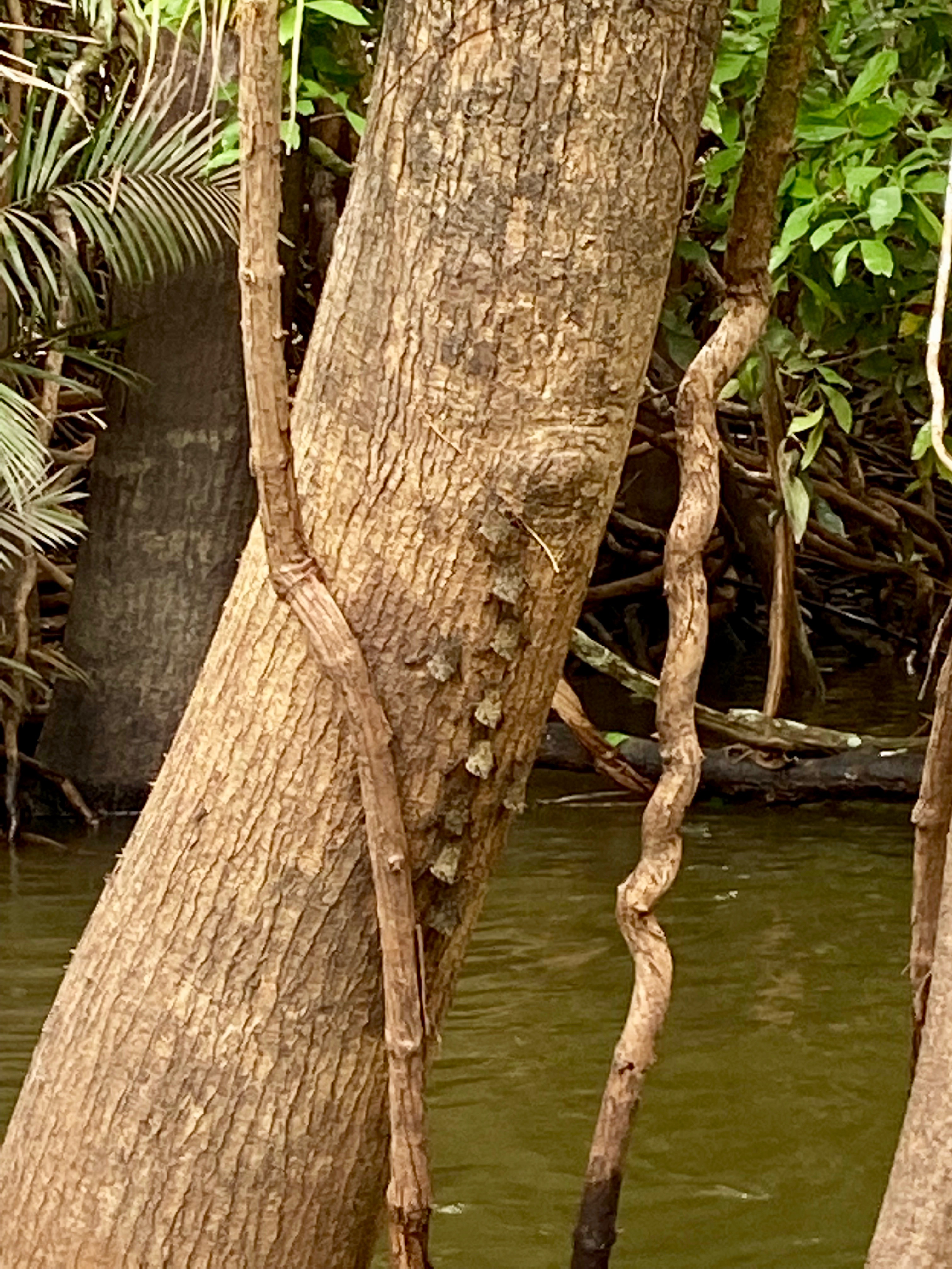 Another amazing day on the Amazon, today I really noticed the water line on the trees, realizing the water level is dropping fast. One of the first things we saw was a line of long nose bats on a tree trunk. Ricardo told us it was a harem with one male bat and many females. Apparently this guy is doing really well; it was a larger group than usual.