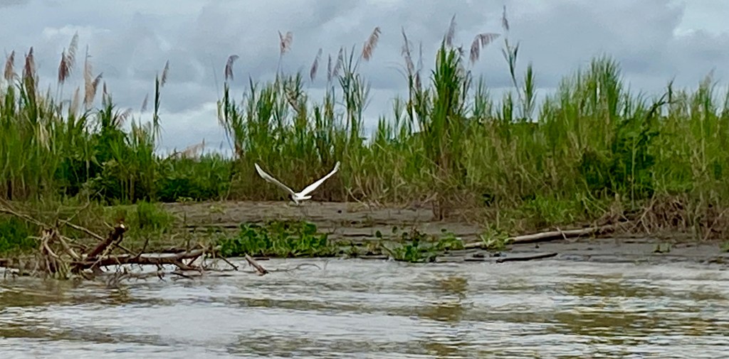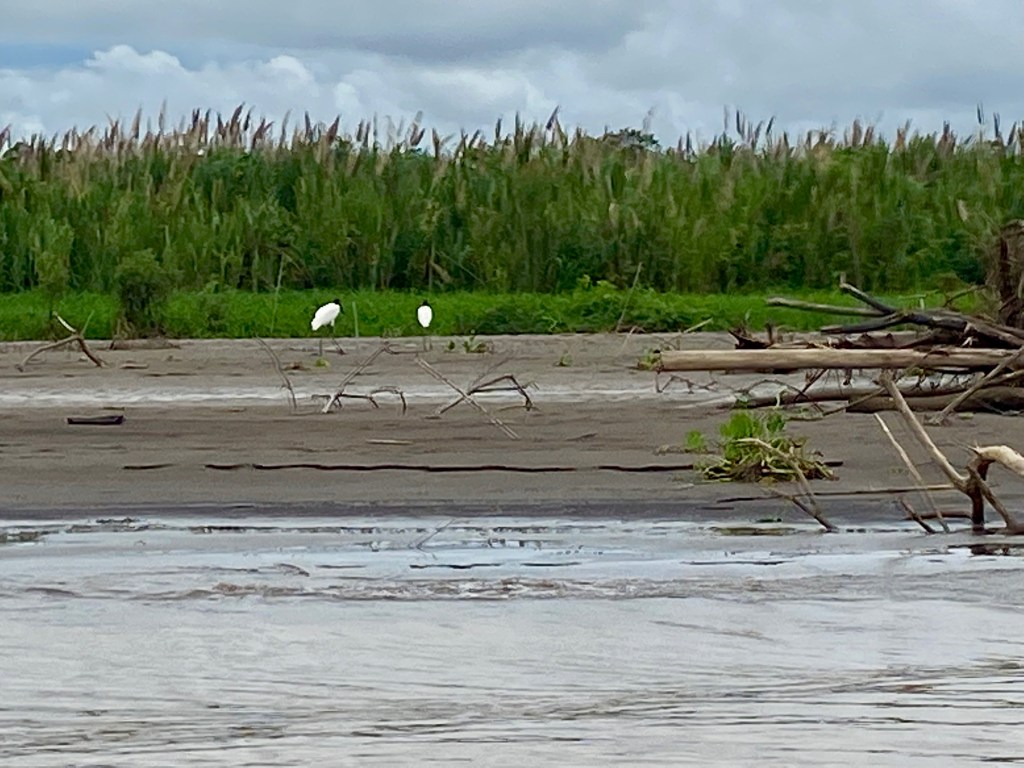 These sandbars appear as the water levels drop. Families will go out and claim areas, marking their “fields” with flags, tee shirts, etc. The spaces are used for planting rice and other crops that thrive in these wet areas. The season is short, about five months, and the people have to harvest before the rainy season begins. On one such area, we saw a beautiful pair on the storks.