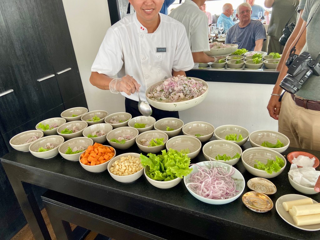 Back on board the Aria for lunch, it was demonstration day once again. Carlos was back making a new series of drinks and got Leslie and Joe to help with the shaking. Harvey gave us a napkin folding demonstration and crafted a lily pad that he added a frog handicraft to; it took it back to my room as a decoration. Finally, our chef made a wonderful ceviche which we all got samples of to start off our lunch. Afterwards, we also enjoyed a food coma and an afternoon break.