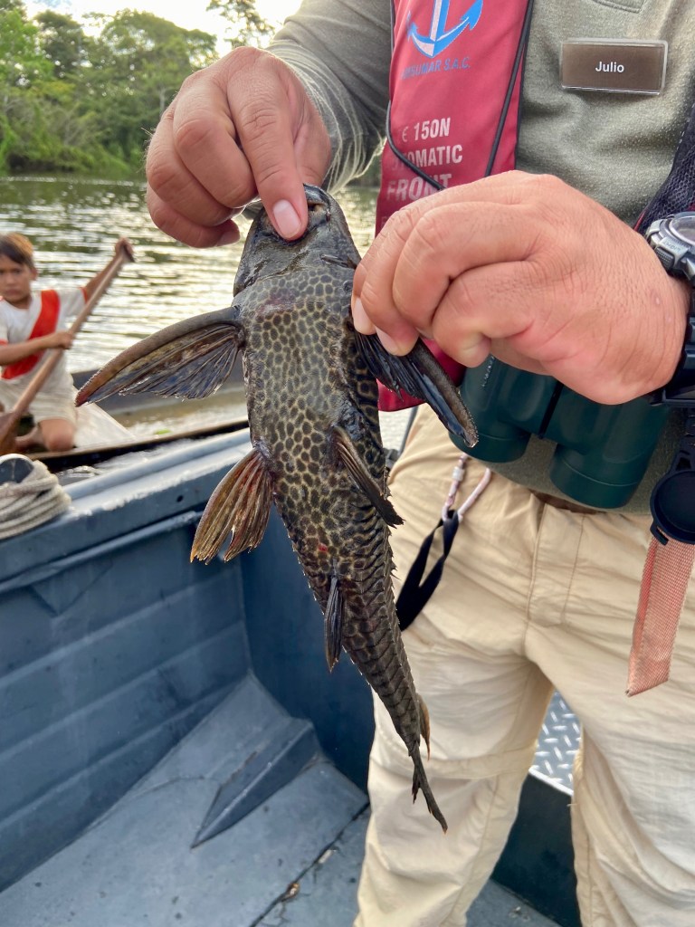 Julio brought the armored catfish inside our skiff and we got a look at the underside of the fish as well. It was spotted like a giraffe, an interesting contrast. Some of the other young fishermen had caught piranhas. They had bright red bellies. Julio gave us a close up look at the teeth on one of them.