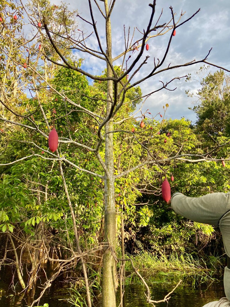 I love being out on the river at this time. The day is cooling and the breeze as we glide along is refreshing. One of the things we spot is the beautiful red fruit with the silk cotton inside. We have seen some with holes where the parakeets have eaten the seeds and made a home. We have also seen sloths lounging in these trees, presumably eating the fruit when they are hungry. The fruit on the trees we came across was not quite ripe. Julio opened one for us.