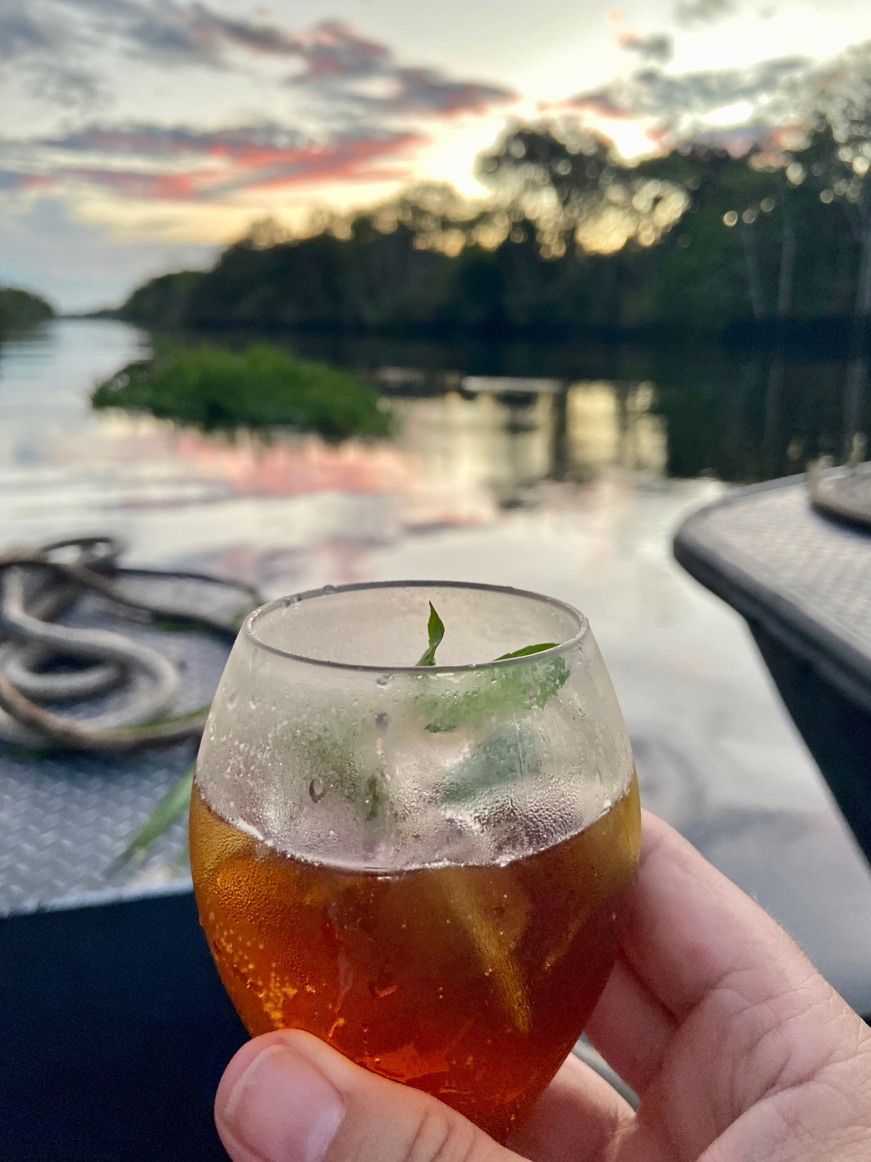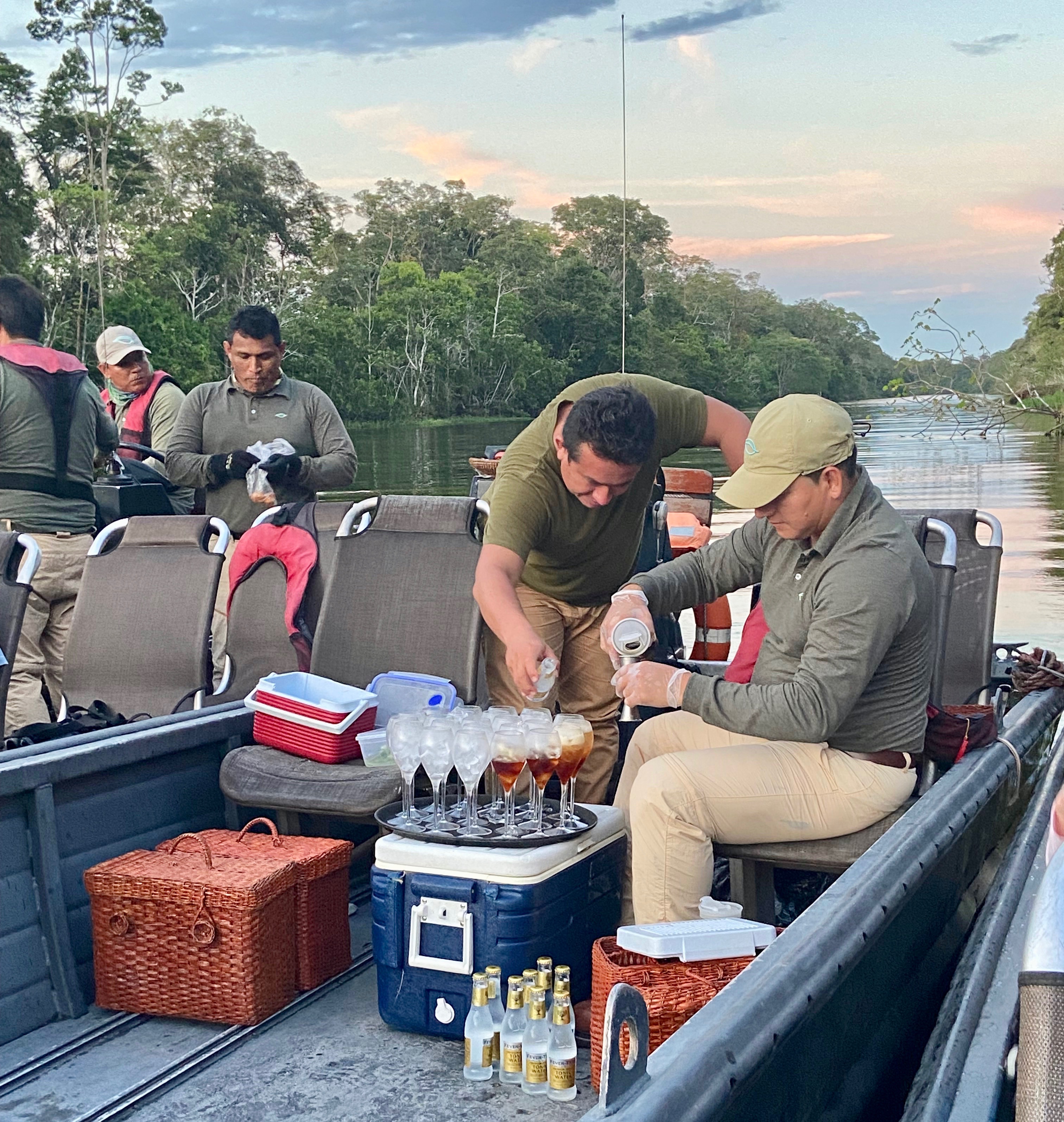 We will be out on the river after dark tonight, so Carlos met us along our route for a sunset treat. Evening cocktails were enjoyed on the river as we got to watch the colors change in the sky with the sun’s setting. It was gorgeous. The on-river cocktail hour was a surprise.
